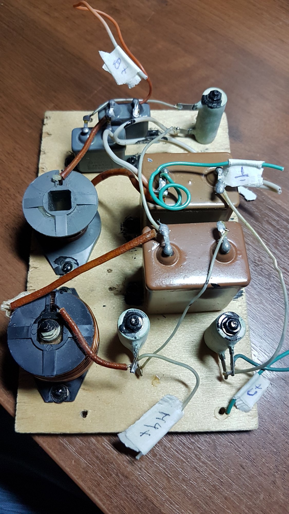 Нижняя слева катуха по размерам к НЧ, от неё на резистор отвод и туда же + НЧ динамика цепляется, с другого вывода резистора проводок идёт на ближайшую банку, которая своей второй обкладкой соединяется всё с той же большой катухой, ну и входной сигнал заходит как раз вот в это место соединения катухи и конденсатора. Нипаняяятна.