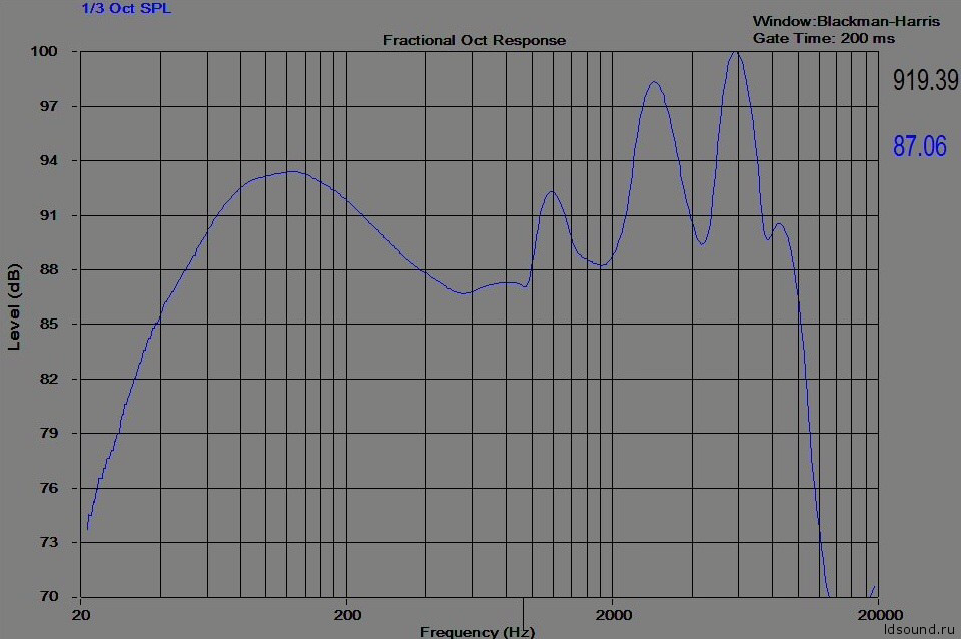 «До критической частоты, когда диффузоры ещё работают в поршневом режиме амплитудо-частотная характеристика имеет весьма гладкую характеристику, после критической частоты появляются резонансные горбы, где алюминий начинает звенеть. Но если настроить разделительный фильтр на докритическую частоту, например 1000 Гц, то сотовый динамик приближается к теоретически идеальному излучателю»