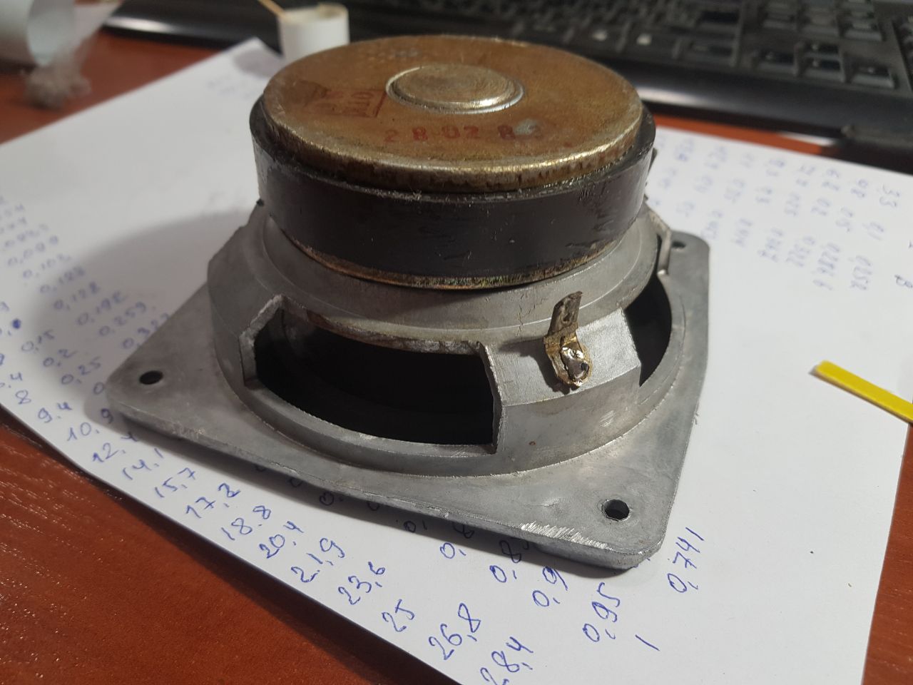 За счет алюминиевого каркаса катушки и медного колпачка на керне, индуктивность всего 32мкГн, и динаммик при столь малой массе, забирается черезмерно далеко в сторону ВЧ