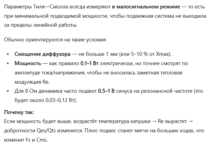 По поводу мощности при которой проводить измерения. Обычно все измеряют без усилителя, от выхода звуковой карты. Насколько это верно? Как мне кажется на рабочей мощности динамика параметры ТС несколько будут отличаться.