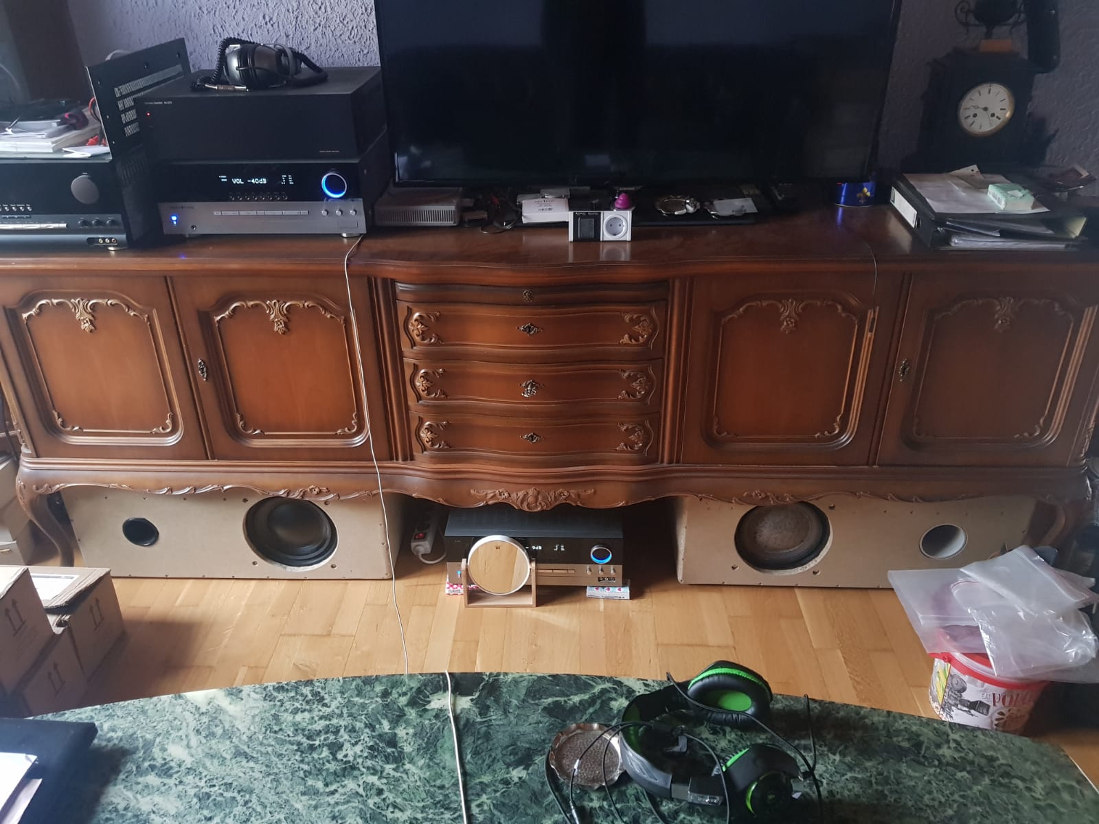 Draw your "indoor catastrophe". It may be enough to successfully position only two bass reflexes for good sound in the listening area.The room is a catastrophe! That's why I want to set up as many woofers as possible to regulate it digitally.