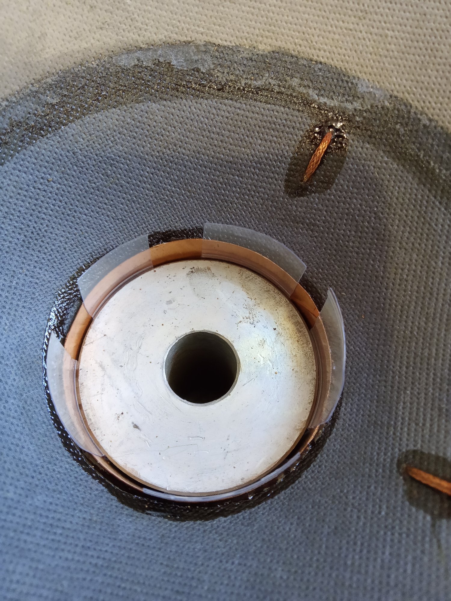 Подвес - польский, saudio.zp, 70 грн один. Внешний диаметр на 0,5мм больше посадочного места, всухую вставлялся, а на клею таки чуть вылез. Второй обрежу. Пыльник отодрал насухо, обе поверхности рифлёные, клей сухой, площадь контакта никакая. Секторами от бутылки 0,5л отцентровал и заклинил ЗК на нужной высоте. Дольше всего отчищал дрянь, бывшую поролоном. На диффузоре пришлось тупым канцелярским лезвием поддирать слой волокон с дрянью, только так и удалил. Клей - Кристалл, прозрачный полиуретановый. На коробке пишет - прижать через 10-15 минут, на тюбике - через 5-10 минут, реально через 2 минуты если пальцы сжать (перед тем - спиртиком), то усилие на разрыв больше, чем выдержит подвес. Работать надо быстро. Диффузор мазал раз, потом ждал 5 минут, второй раз намазал и приклеил. Через час уже слушал. Подкрашивал маркером, до склейки. Пыльник также Кристаллом, в один заход. Через 3 часа измеренные параметры: резонанс в воздухе 25 Гц, сопротивление на резонансе 54 Ома (!). В ящике 93л резонанс 39,5 Гц, откуда эквивалентный объём 139л. Отлично. Призвуков нет, ход - до стука и до выпрямления подвеса. Второй даст через неделю.