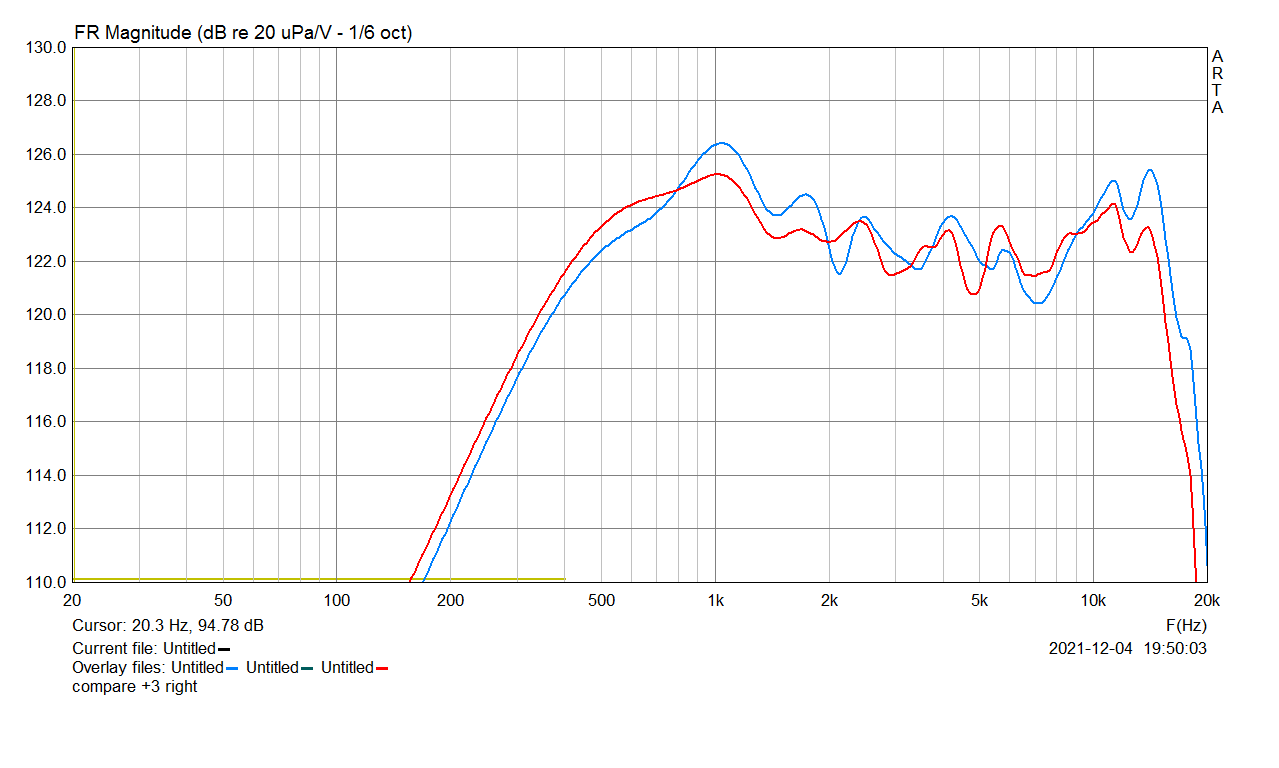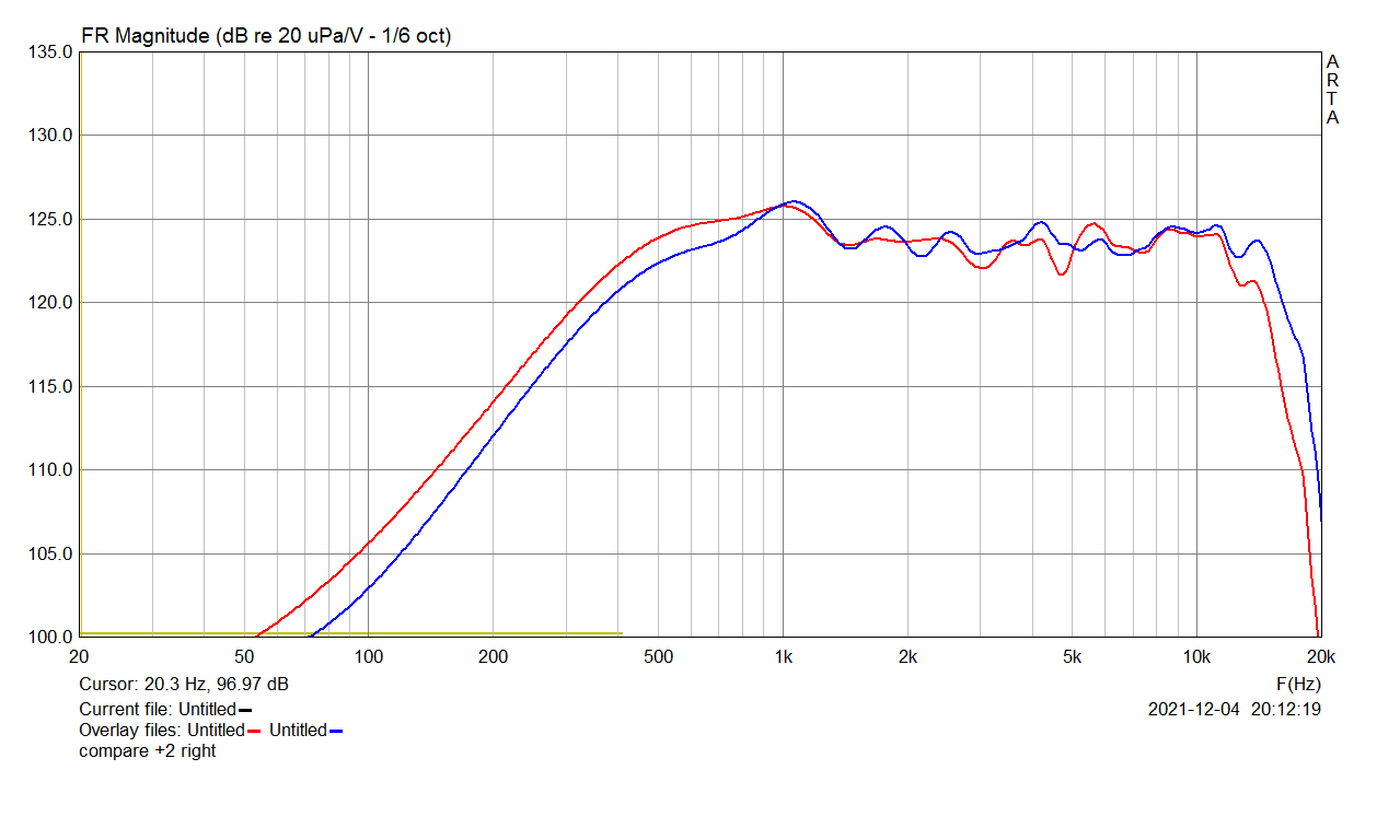 Тут уже некоторые различия есть, но минимальные. Тем более что микрофон был немного сдвинут между замерами. Возможно что и второй замер АРТой уже отличался бы от первого.