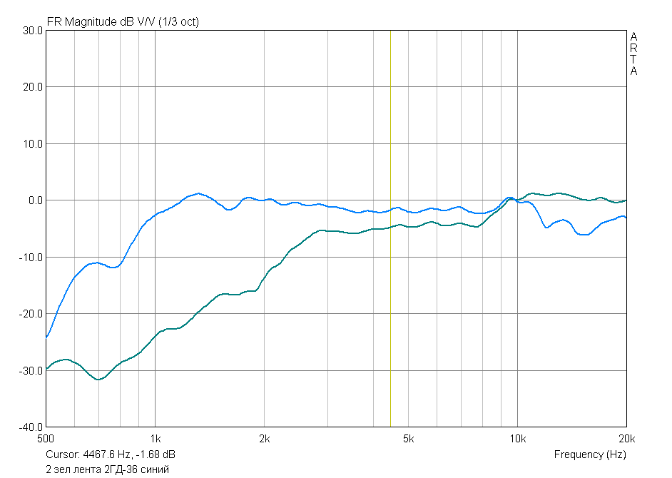 Выбрал 2ГД-36 получше из кучки и растянул график по горизонтали. Сделал вывод (не знаю правильный или нет) что у этой изодинамической (или какой-то там) пищалки есть 90 дБ, но только от 10 кГц и выше. Это супертвитер, а от 3 до 8 кГц примерно 85 дБ.