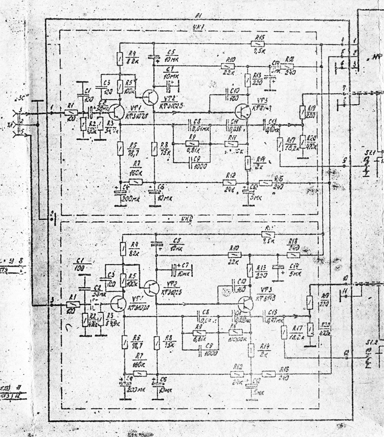что бы разобраться вам с этой проблемой надо иметь как минимум электросхему, мокрый палец(а лучше высокоомные наушники ТОН-2м), и понимание как проходит сигнал звуковой частоты.. ну или тупо менять конденсаторы по совету Юрия Робертовича.... правда после такой замены,за неимением опыта из усилителя может выйти "ВОЛШЕБНЫЙ ДЫМ".. тогда вам его в утиль либо искать МАГА-ВОЛШЕБНИКА, который совершит таинственный обряд по оживлению мертвеца...