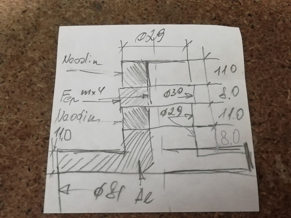 сделали "беззазорную" МС: нахлобучили друг на друга (через стальную шайбу h=2 мм) два неодима – нижний высотой пусть 15 мм, верхний – около 10 мм. Шайба по диаметру чуток больше магнитов