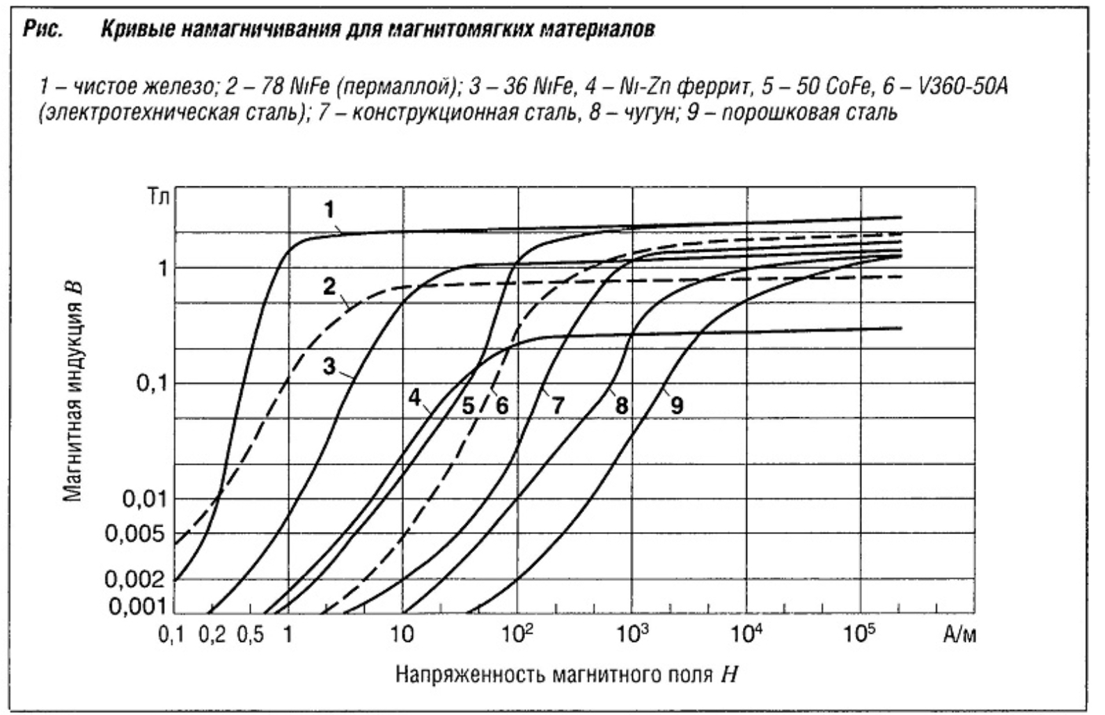 Смотрим при какой напряженности магнитного поля входит в насыщение железо и при какой сталь конструкционная.