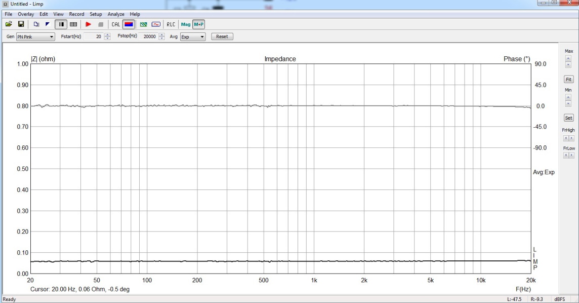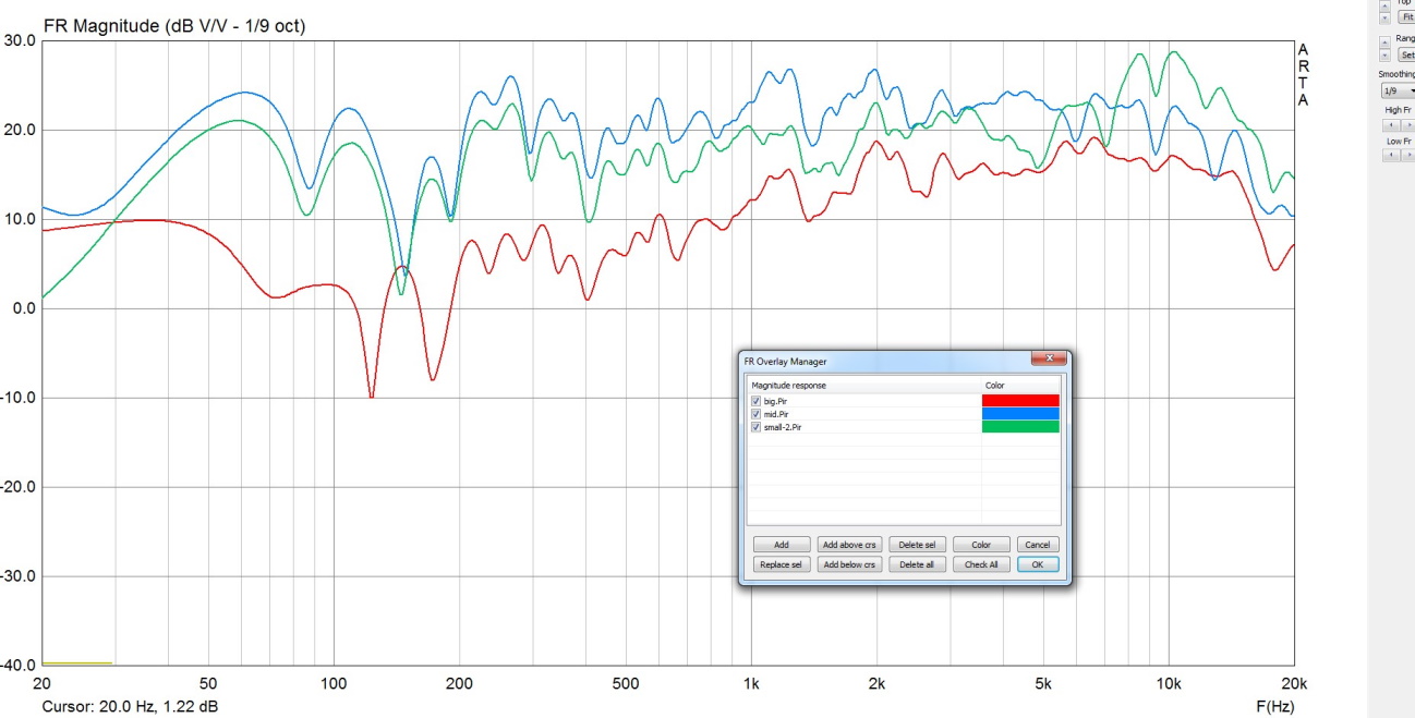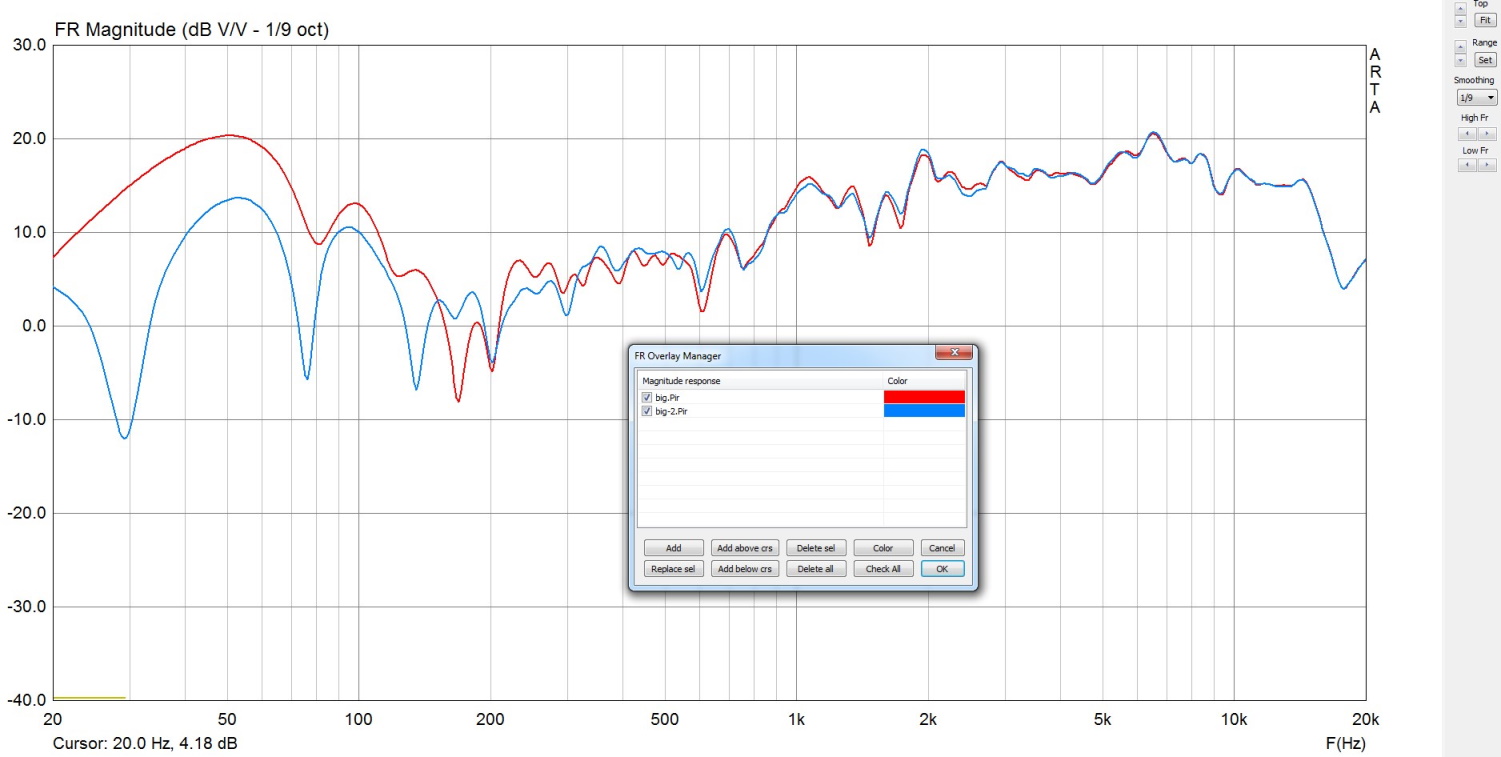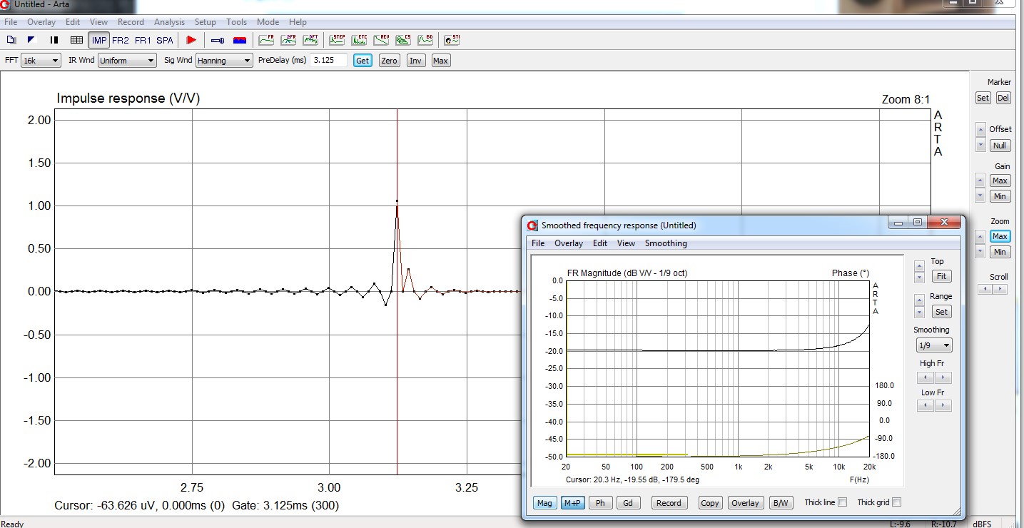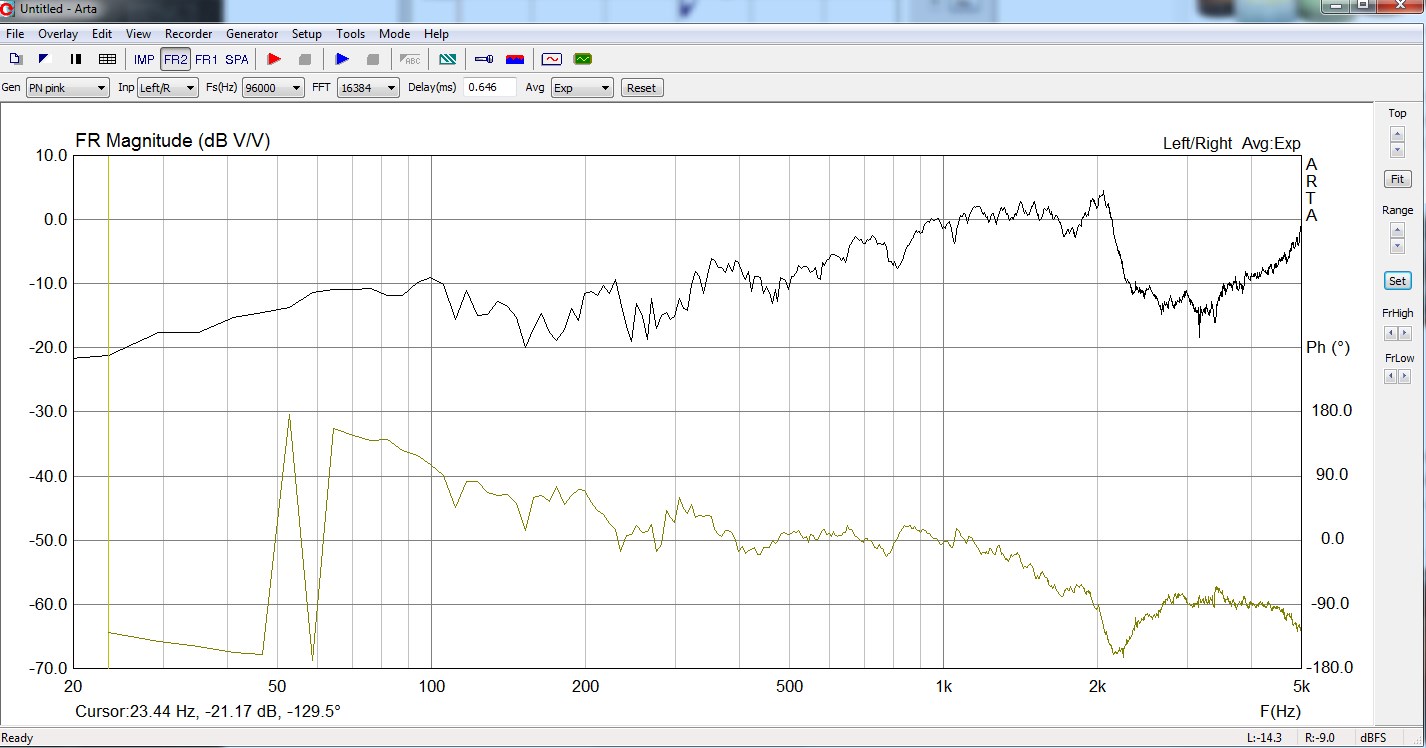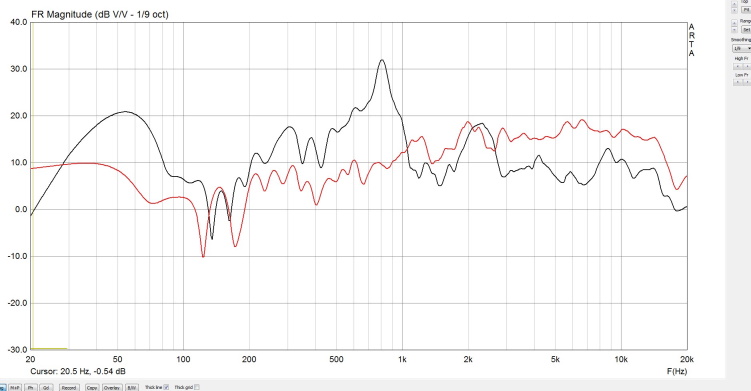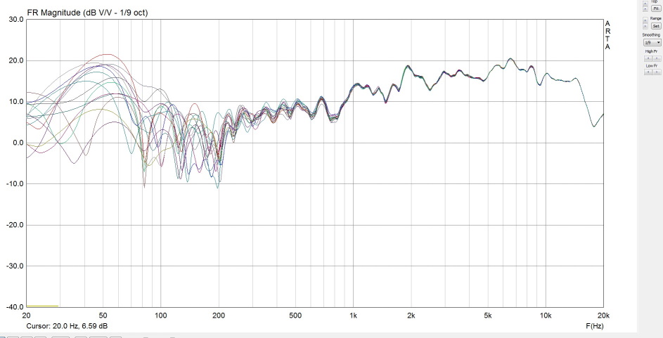 Измерение пары НЧ+СЧ с окном до первого отражения и с максимально возможным окном. Соотношение сигнал/шум на ВЧ было недостаточно, в результате выше 7кГц шум оччень интересно присуммировался к сигналу от динамиков! Сам шум имел тенденцию к увеличению с крутизной 6дБ/окт, начиная с 5 кГц. Впрочем, уменьшение окна в 10 раз практически устраняет неприятность. (По материалам темы Ямаха 6490.)