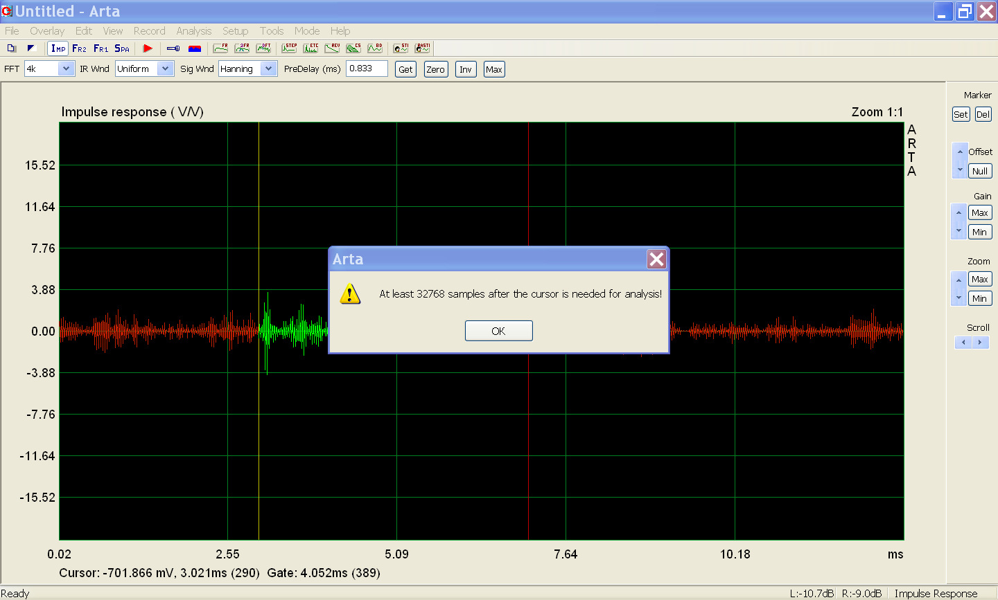 Все-таки не дает двухканальные измерения проводить. При любых кручениях-верчениях, настройках выдает ошибку при попытке Analysis - Dual.