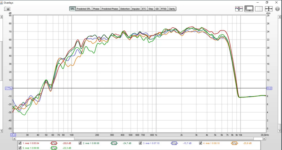 "...сделал замеры влияния поворота колонки относительно микрофона. Результаты достаточно интересные. Красная линия - исходная АЧХ, остальные зависят от поворота колонки: темно зеленая - 45 град., синяя - 90 град., оранжевая - 135 град., светло зеленая - 180 град. (то есть повернута задницей к слушателю)."