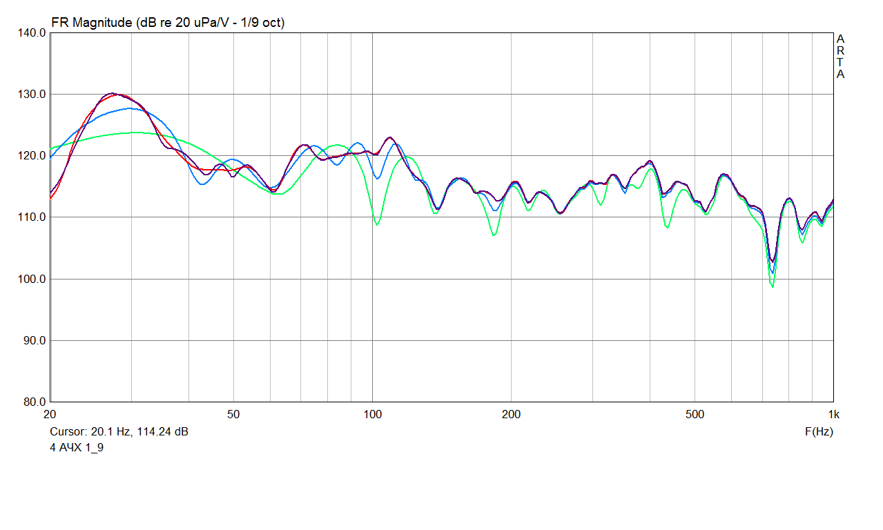 Совместная работа двух сателлитов #220 + секции НЧ #53 . Микрофон - на месте прослушивания. АРО настроен для старого варианта трёхполосника (синий), добавил яму 250 Гц и убрал яму 167 Гц (зелёный), расширил главную яму 130 Гц вверх (красный). Во вех трёх вариантах выставлен подъём +5дБ на 400 Гц для компенсации хронического провала, имеющего место со времён первых измерений трёхполоски, и +5дБ на 20 кГц, на 16 кГц 0дБ - для компенсации спада ВЧ динамика. Последний подъём больше для красоты и хлопцев, я разницы не слышу. Верить можно выше 100 Гц. Шум в каналах, наверное, когерентный. С усреднением 1/12 на участках 700...1000 Гц и 3...4,5 кГц появляются "заборы" +/-5дБ, остальное не меняется. Расхождения выше 1,5 кГц из-за не точного положения микрофона, держал рукой на линейке.