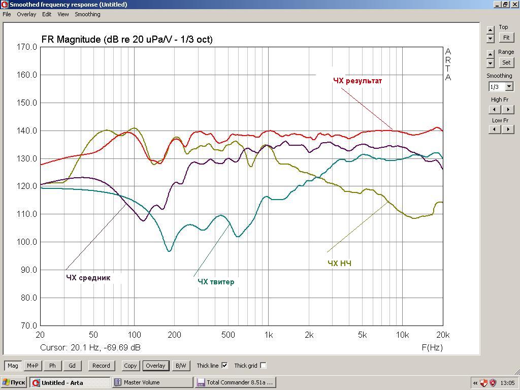 4. Синфазная работа НЧ и СЧ от 250 до 2300 Гц дала +6дБ добавки к убитому Вами уровню и круто выровняла личные бяки динамиков! Это - плюс конструкции (см. скрытые минусы).