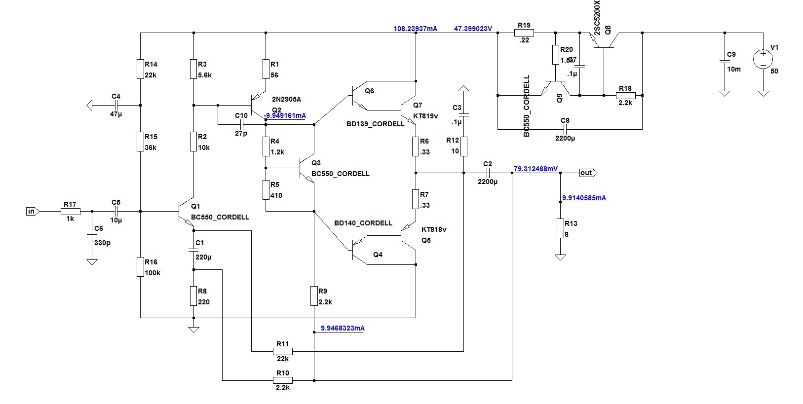 Во всех каскадах местные ООС, поэтому общая неглубокая. Ток драйвера порядка 100ма, может поменьше. Класс В. И никаких дурацких троек Локанти. Интересная ПОС в выходном каскаде. Не вольтдобавка, а токодобавка драйверу.