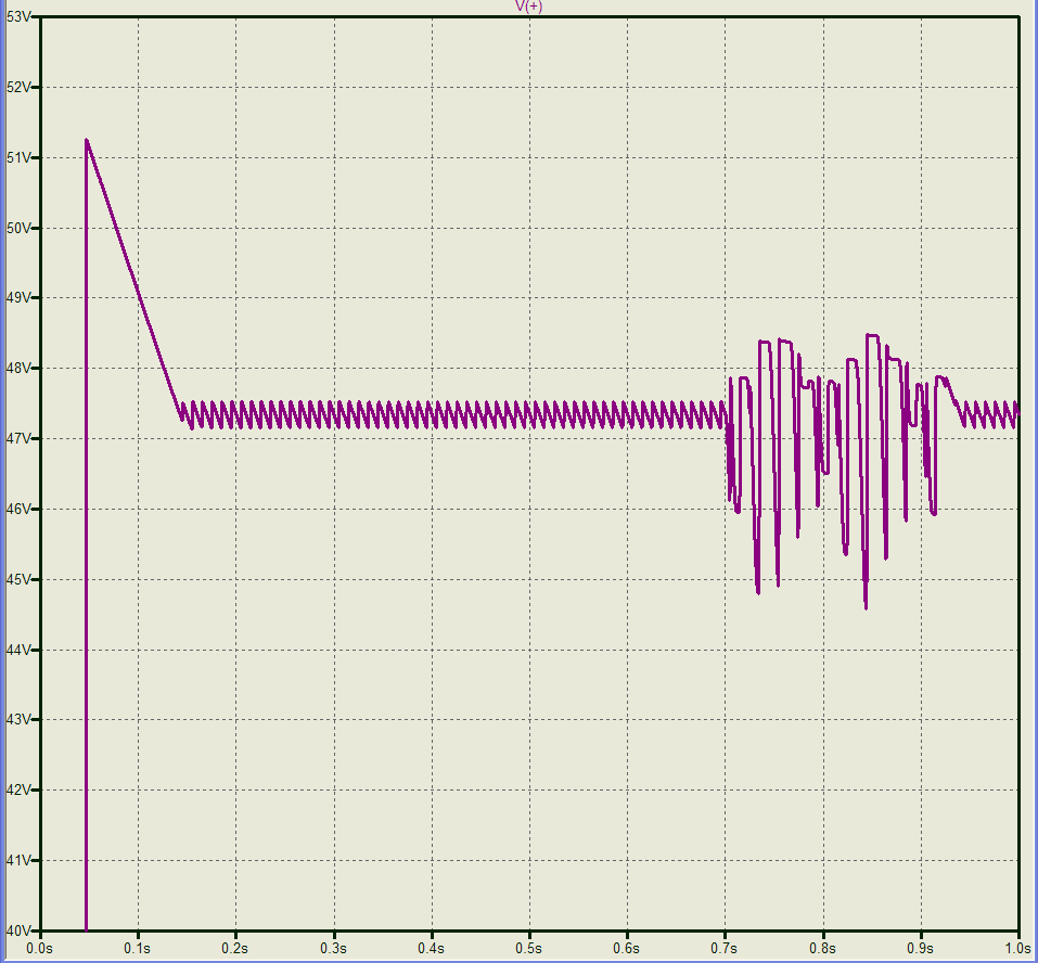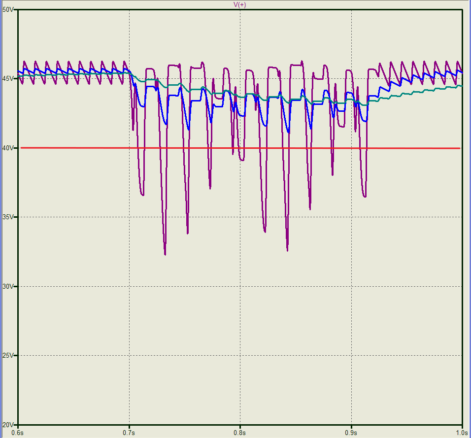 Видно, что пара миллифарад неработоспособна, напряжение питания просаживается ниже 40 вольт;
