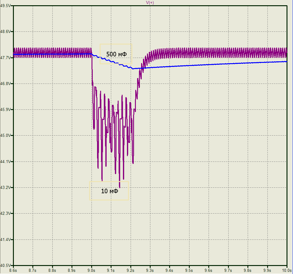 10 мФ тоже не справляются, напряжение питания падает до 41 вольт - будет лёгонькое ограничение;