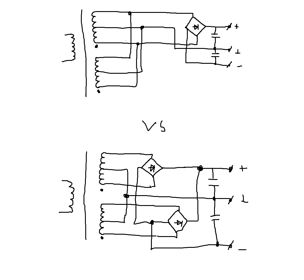 Логично, зарядные токи для дппв схемы (не мост Гретца) требуют своих контуров. Если не возражаете, то если убрать "две левые диагонали" в "земляном ромбике" и завести выводы полуобмоток на соответствующие контакты, то токи заряда первых емкостей не будут "мешать" друг другу.