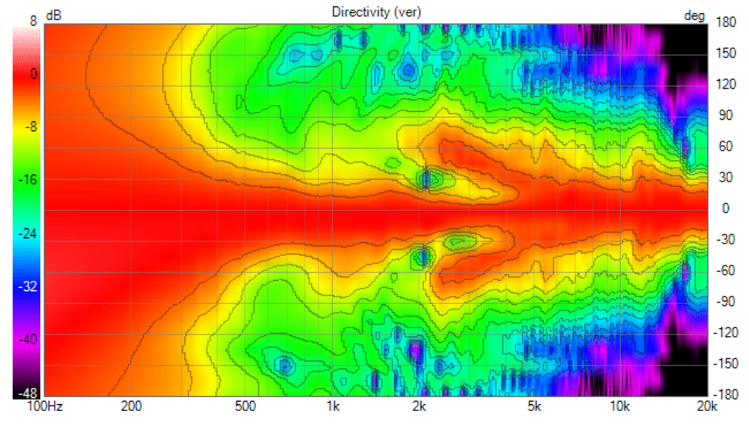 Интересная ДН неизвестной АС, из описания Арты. ДН снята по горизонтали = полностью симметрична относительно оси. АС - три полосы, имеем 2 сужения ДН в полосе звуковых частот: там, где НЧ или СЧ динамик становится направленным, а меньшой брат ещё не подпевает.