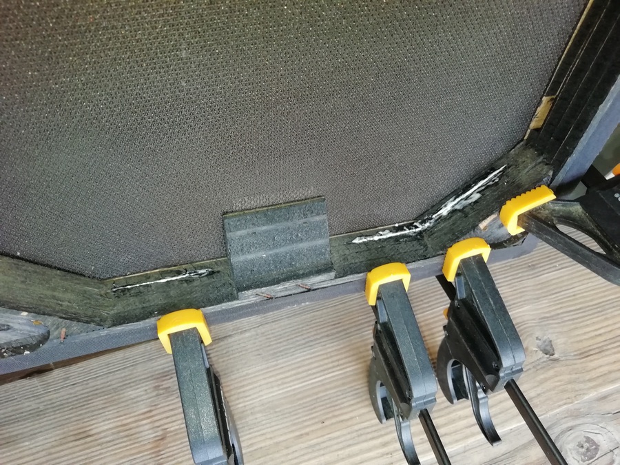 К новым корпусам восстанавливаю неисправности рамок грилей. Начал с самого лёгкого. В нижней части лопнула и сместилась часть рамки. Нанёс Момент Столяр, запихал его в щели тонкой, но жёсткой полоской пластика и стянул струбцинами.