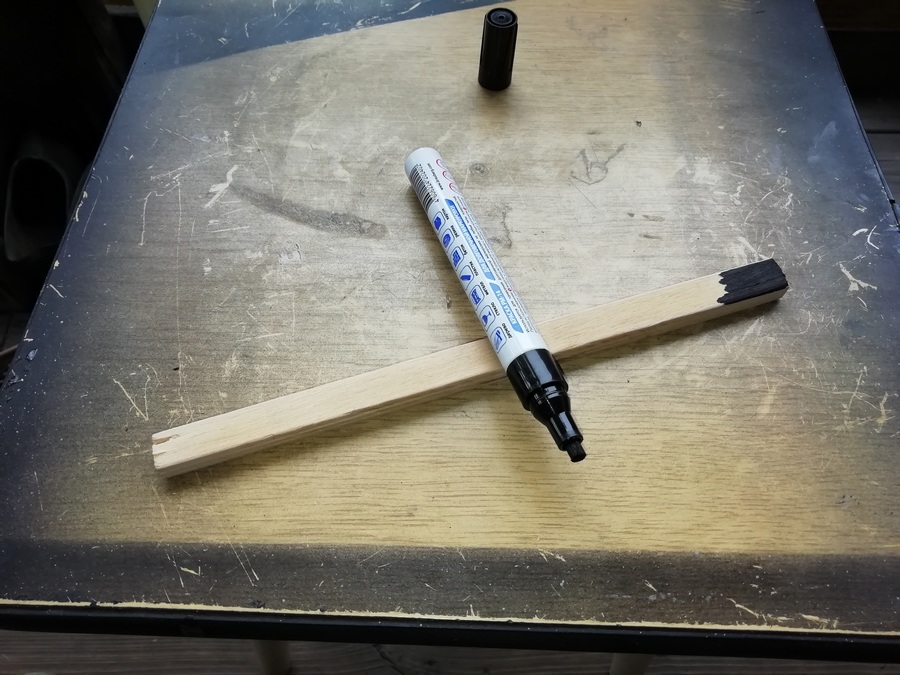 Ототго и разболтались углы. Расслоённую распорку удалил и вместо неё изготовил из 8,0 мм фанеры новую распорку в размер. Обошёл её со всех сторон наждачкой и покрасил тем же эмалевым маркером в чёрный цвет. В общем и целом, фактически аналог старой и целой. Сравнивал с другим грилем.