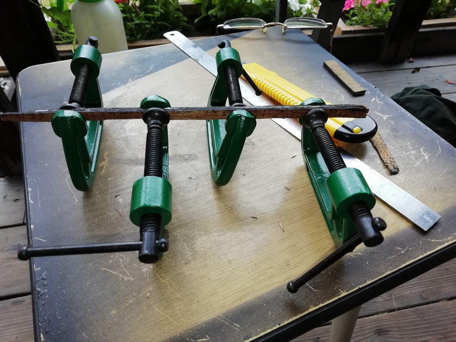 Пришлось при помощи тонкой, узкой пластиковой полоски внедрять Момент столяр между слоями, а потом под струбцины