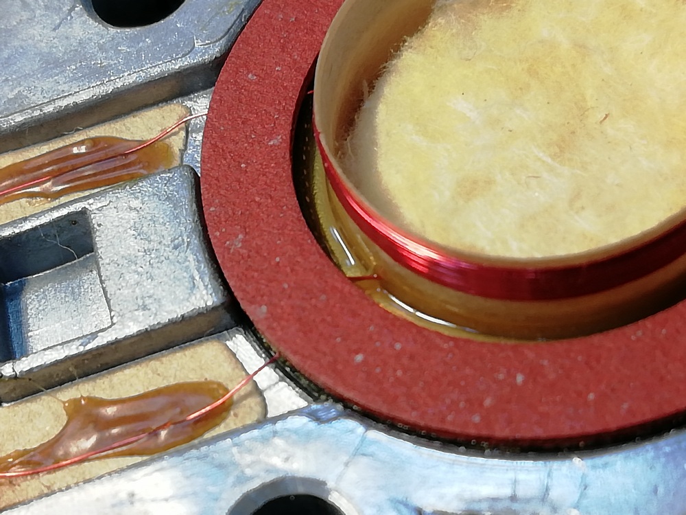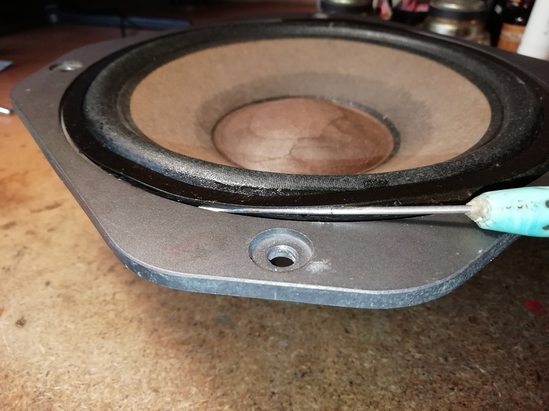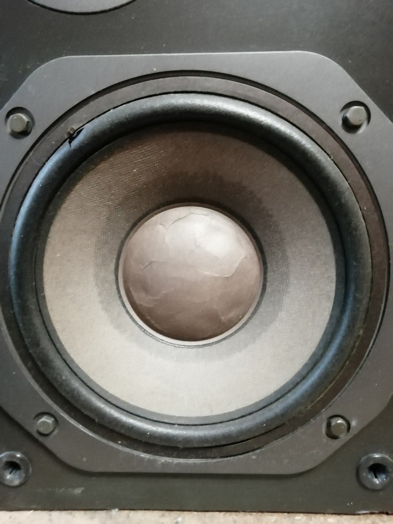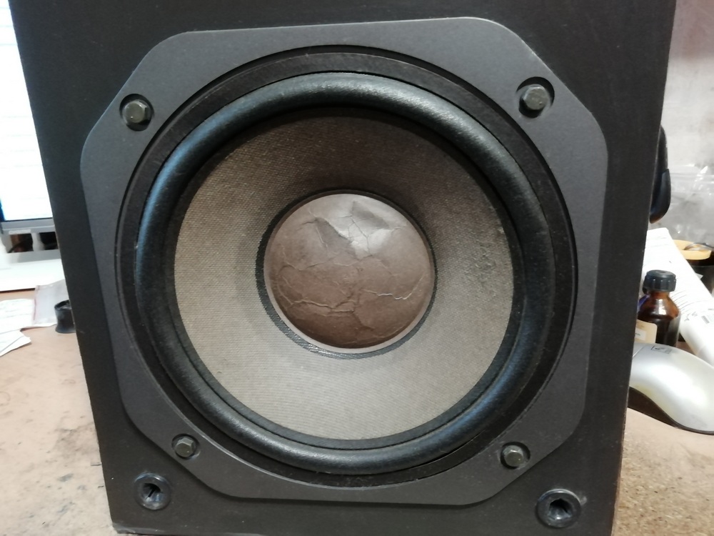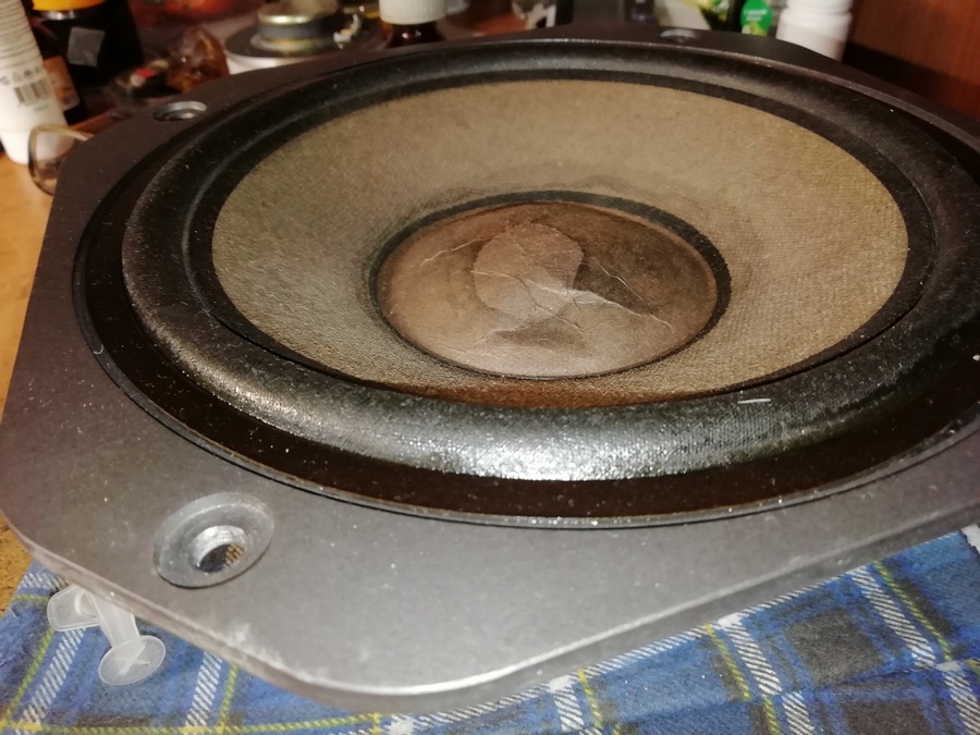 У НЧ колпак менее деформирован, зато проткнут подвес в верхнем левом углу. Подвесы у обоих НЧ жёсткие и чуть липкие. Видимо жижей проходились по ним.