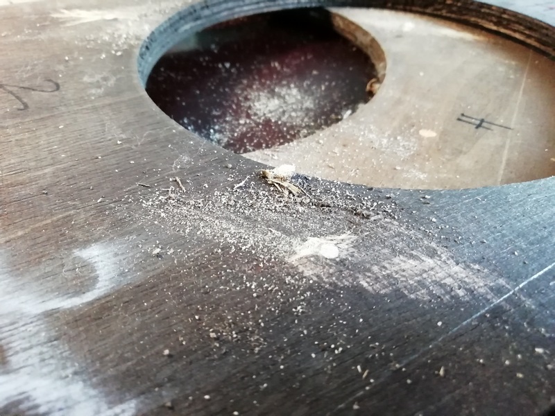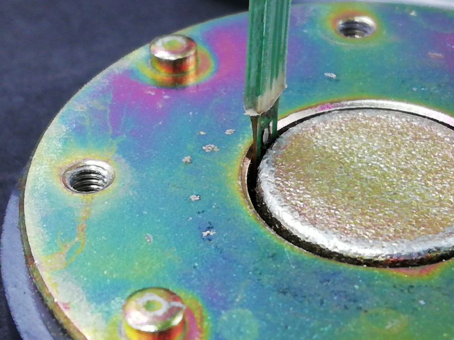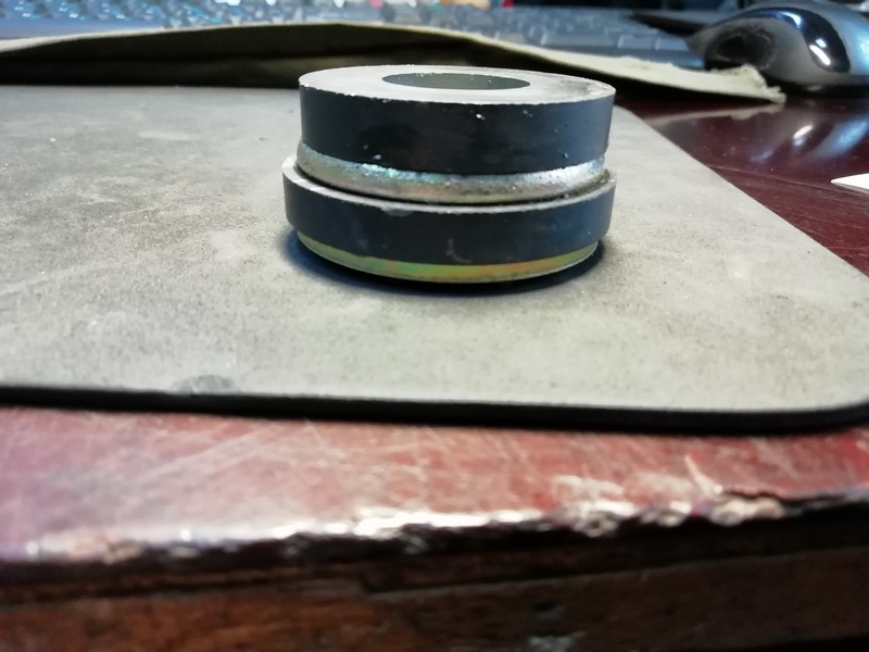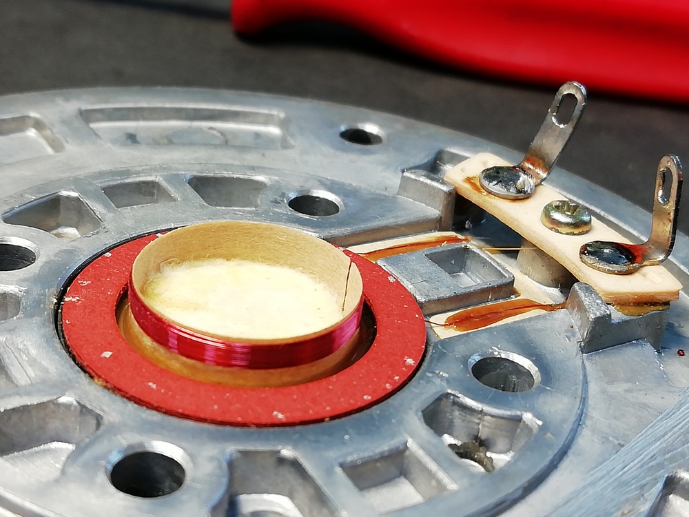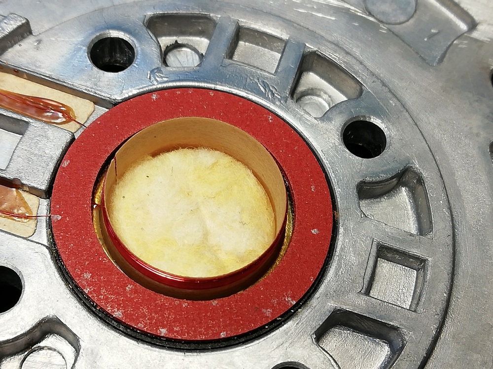 У НЧ колпак менее деформирован, зато проткнут подвес в верхнем левом углу. Подвесы у обоих НЧ жёсткие и чуть липкие. Видимо жижей проходились по ним.