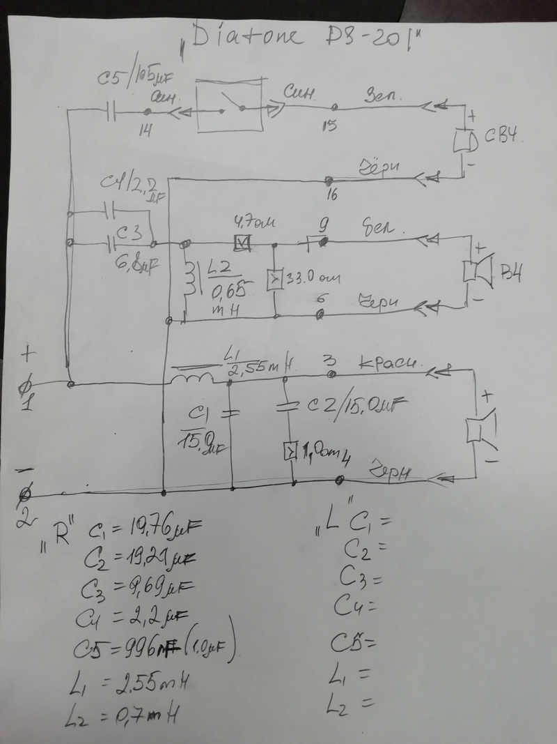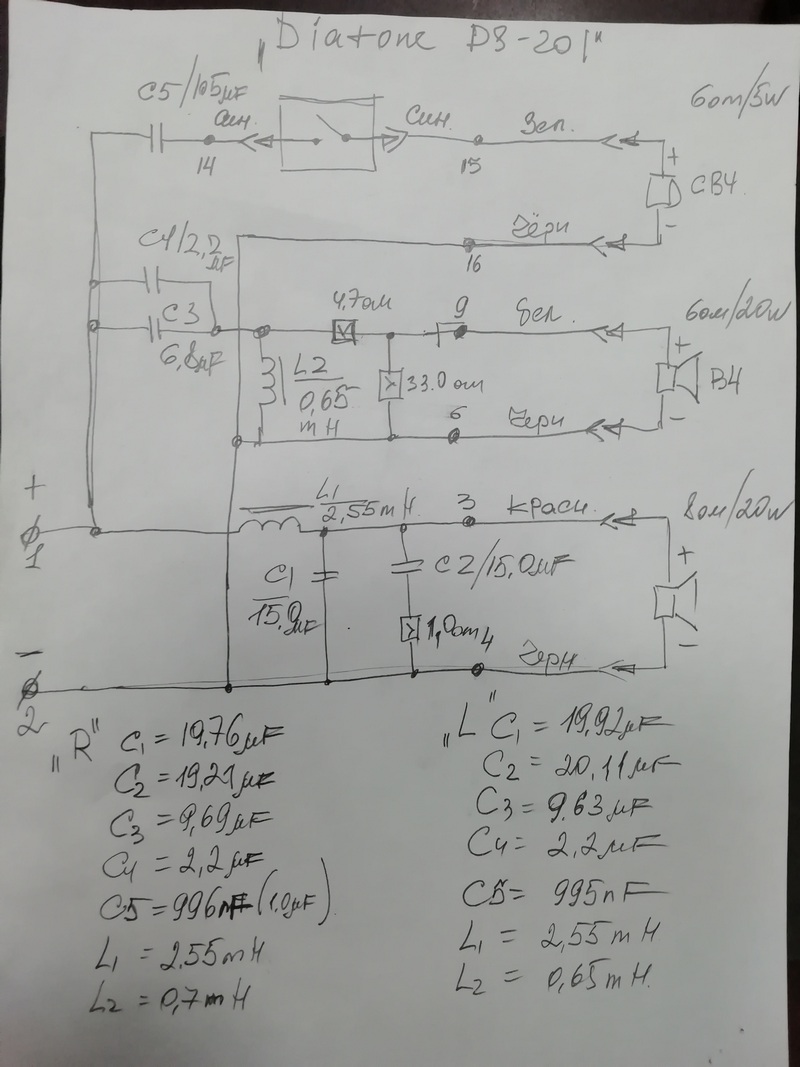 Сопротивление СВЧ = 6,2 ома. ВЧ = 2,5 ома. Сказываются элементы фильтра. НЧ = 6,2 ома.