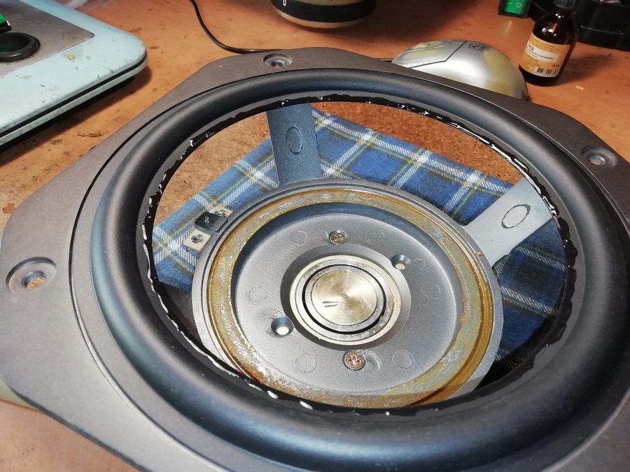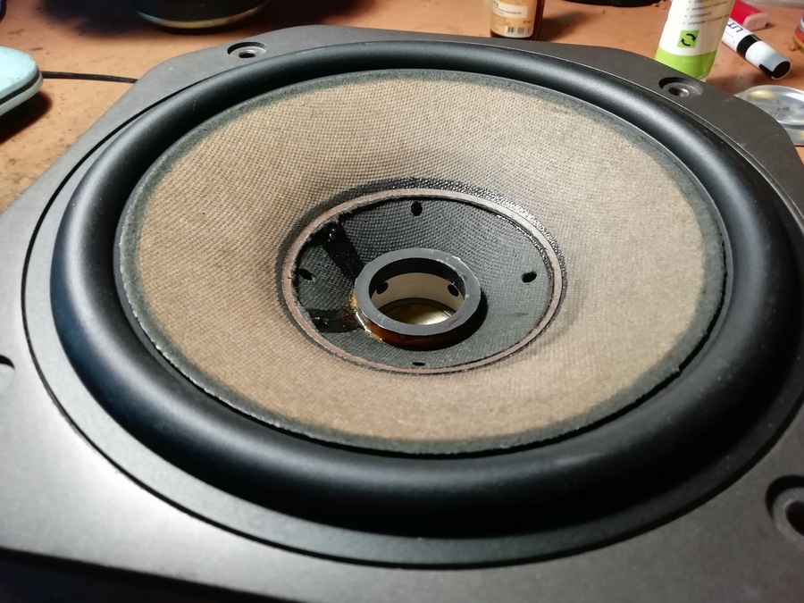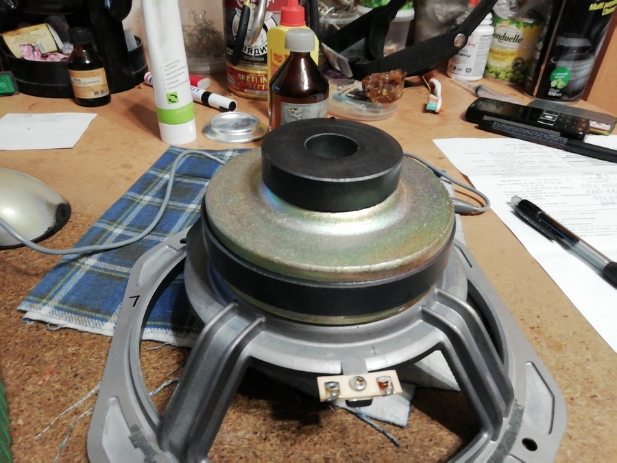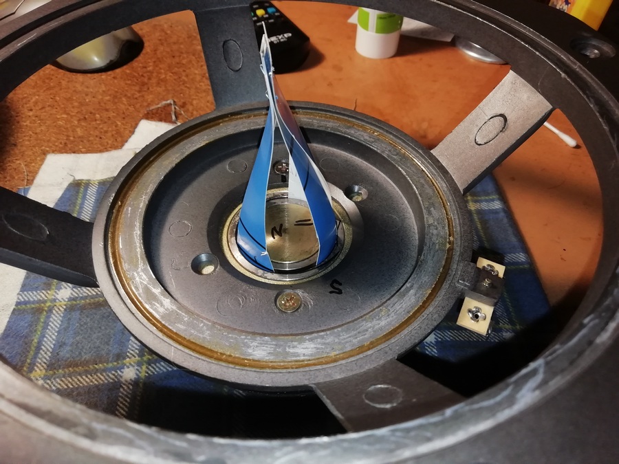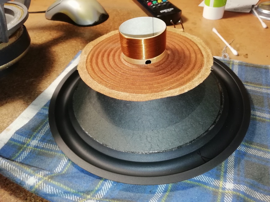 Так как подвес предполагалось приклеивать точно так же как прежний, факт пропитки немаловажен. После высыхания была сделан прикидка по положению подвесов и подвижки относительно корзины и МС. Верхнее расположение подвеса над диффузором, утапливало подвижку вниз к МС (прогиб ЦШ). Нижнее расположение подвеса под диффузором, показывало идеальное положение подвижки.