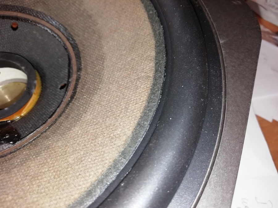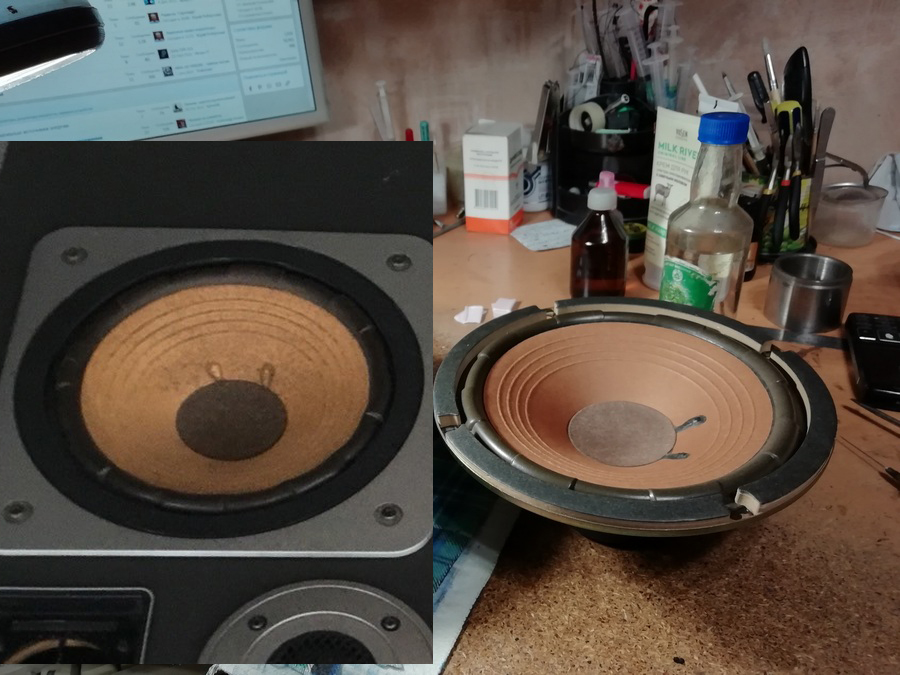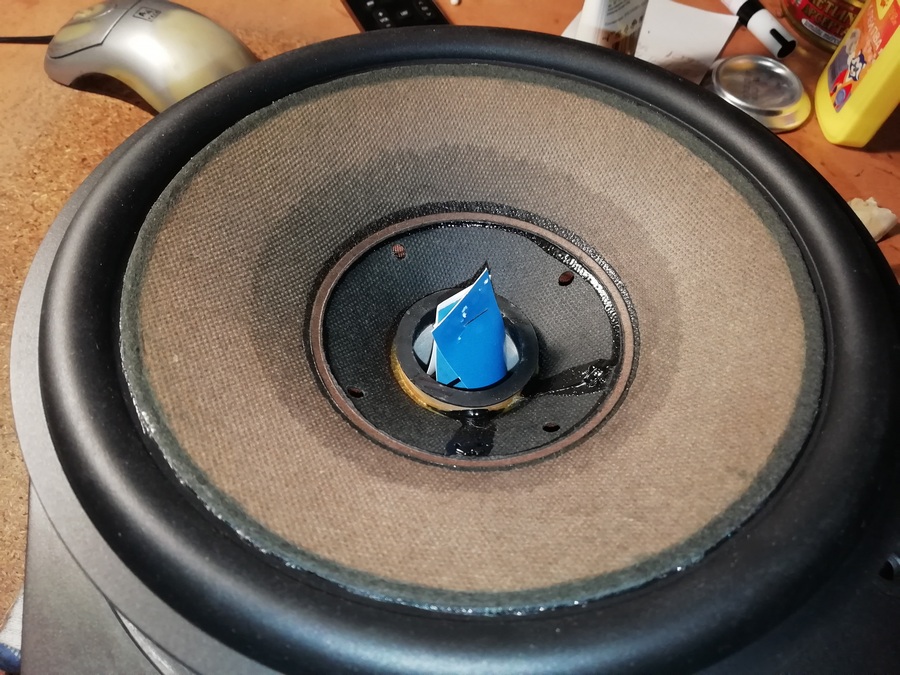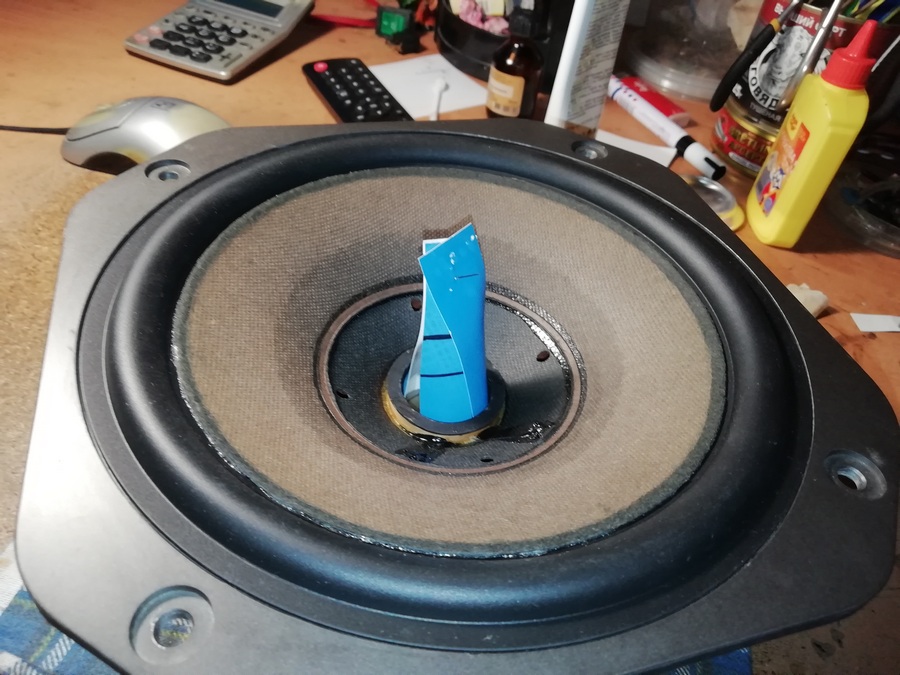 на диффузоре по клею был проход пальцем по всей окружности. Так как подвес лежал в корзине фактически идеально по наружному диаметру воротника то особых мучений по ровной укладке диффузора не было