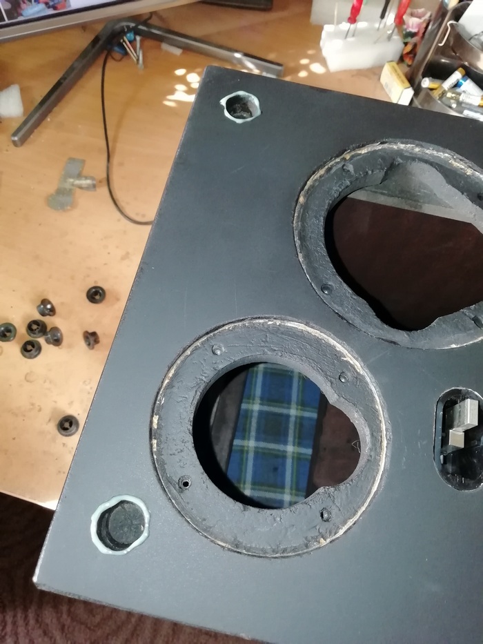 НЧ динамик был прикручен к корпусу без всяких прокладок. Именно так как и было изначально. С завода. Все привалочные поверхности корзины НЧ имеют идеально ровную поверхность как и поверхность фронтальной панели тоже на уровне ровности.