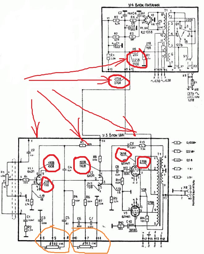 меж половинками лампы оставляешЪ R6 и С4, остальное можно в утиль... R6 нижним концом на "землю", на верхний крепишЪ конец от С4Камрады, подскажите, на сколько критично выдерживать напряжения на лампах, указанные в схеме. В инструкции написано, что допуск +-10%. Но из-за того, что в розетке почти ~230 В, напряжения завышены, анодное выше +300 В, на сколько это критично и как привести в норму напряжения? Доматывать первичку или подбирать сопротивления в БП?