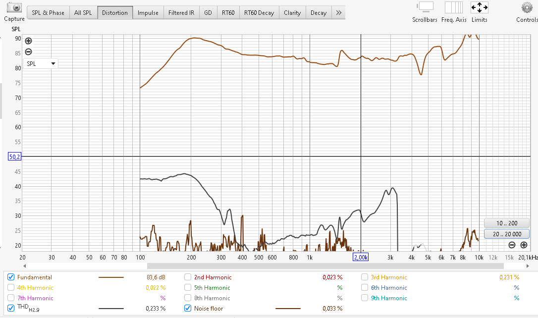 А это его АЧХ и искажения полученные в ближнем поле, когда я его установил в корпус. Это мне нужно было, что бы понять на какой частоте его оптимальнее всего резать. Искажения мне подсказали что нужно резать на 2,5кГц по верху и 300Гц по низу. На 1,5кГц виден резонанс корпуса СЧ динамика который я позже убрал наполнителем.