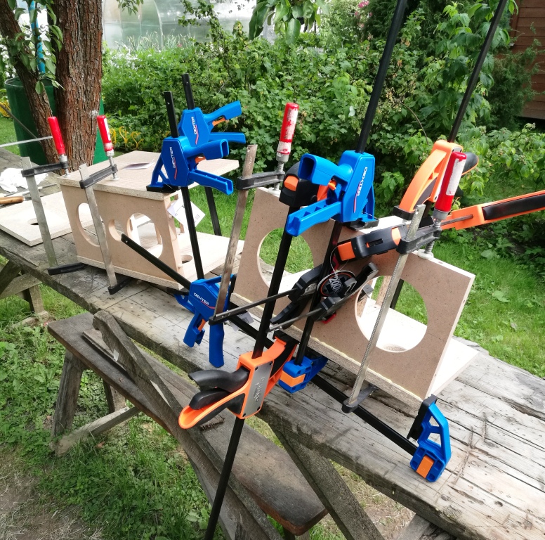 Так что, в отличии от сборки по-старинке, на шурупах, при сборке и склейке на шкантах, струбцин много не бывает! Как-то так: