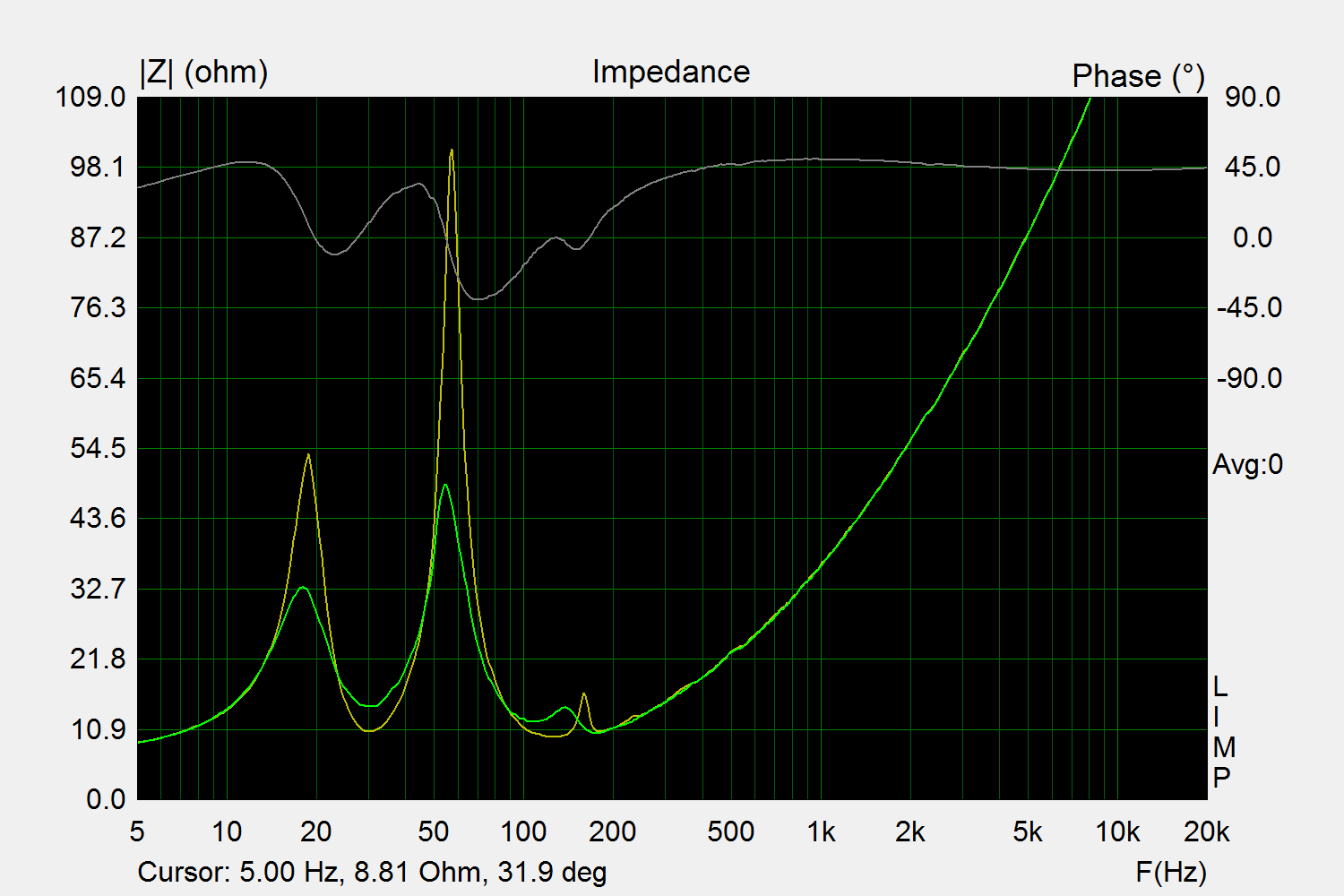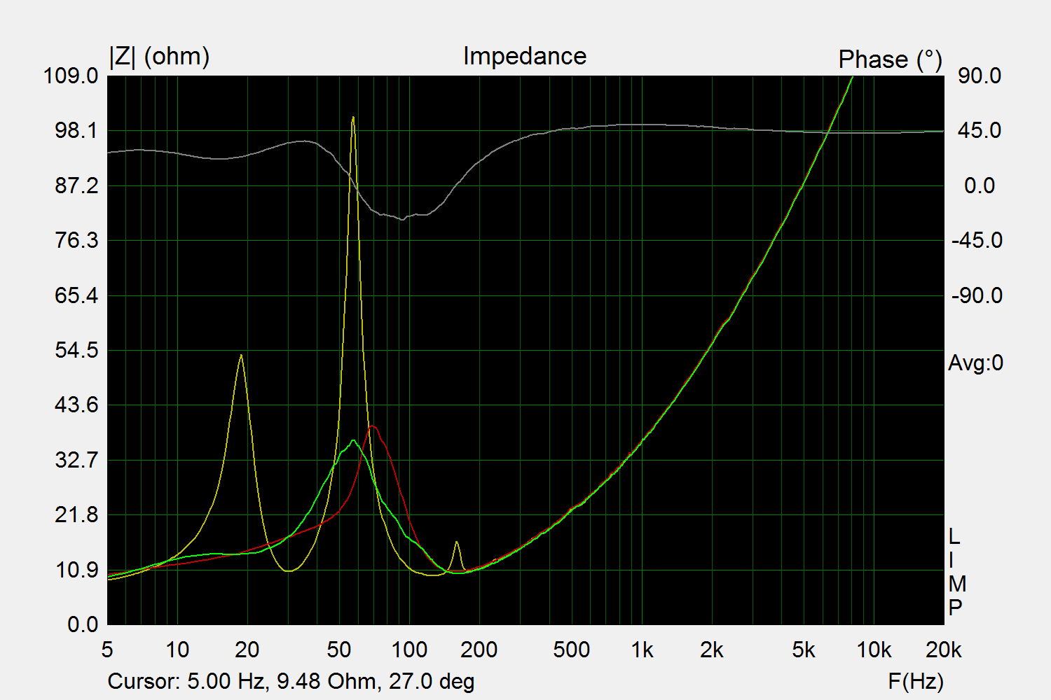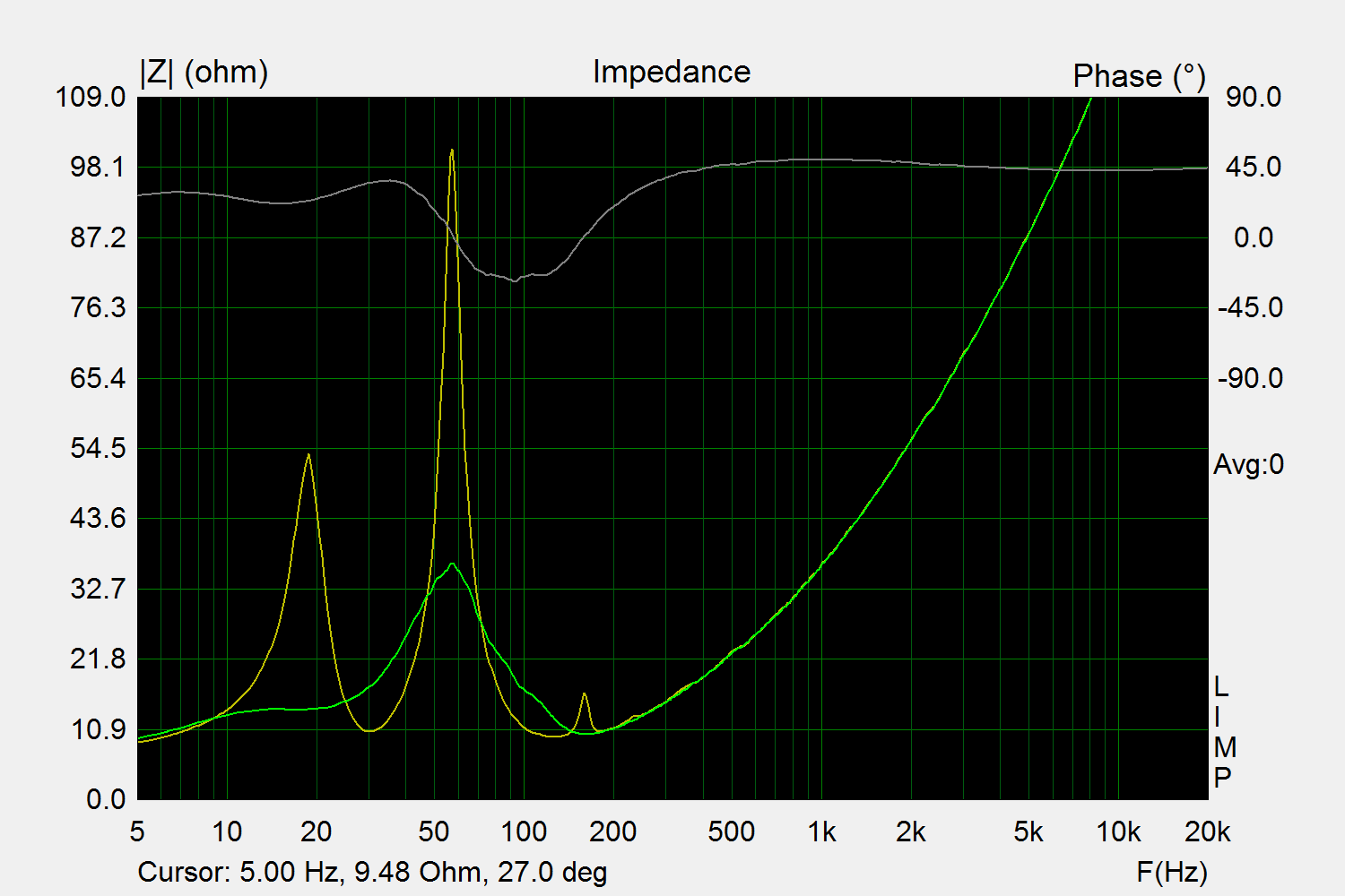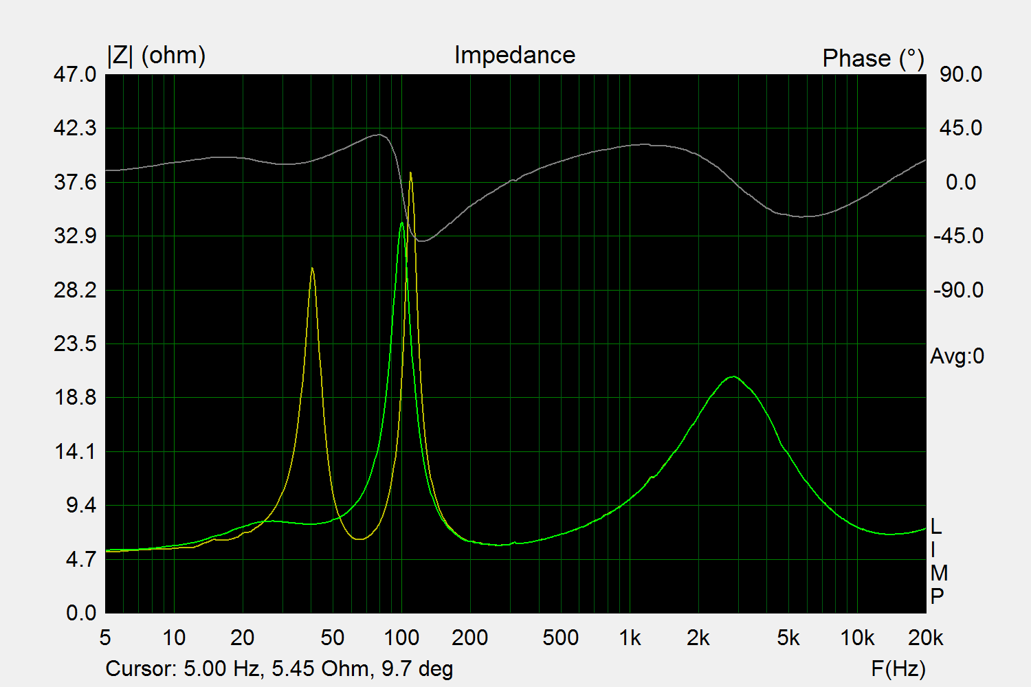 Теперь к вопросу о том, откуда два горба на импедансе при ФИ оформлении. У ФИ тоже есть добротность, и величина её зависит от потерь в трубе. Как мы уже знаем, на частоте резонанса ГД фаза сигнала уплывает на 90 градусов, и единственным способом вернуть фазу на место будет расчёт такого ФИ, у которого добротность будет обратно пропорциональна добротности ГД.