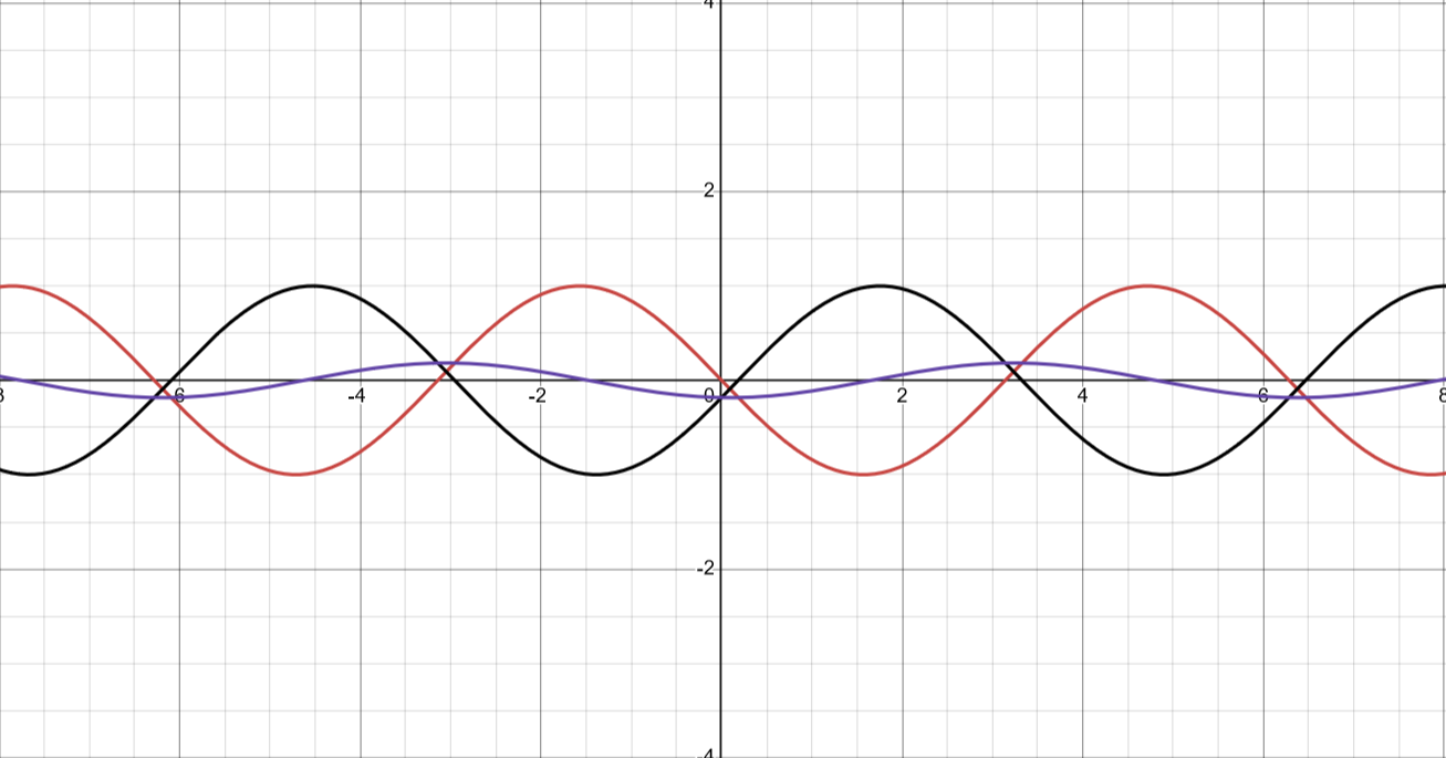 При ню = 1 чёрный с красным сдвинуты на 90 градусов, а их сумма на 45. Заметили, что амплитуда стала уменьшатся?