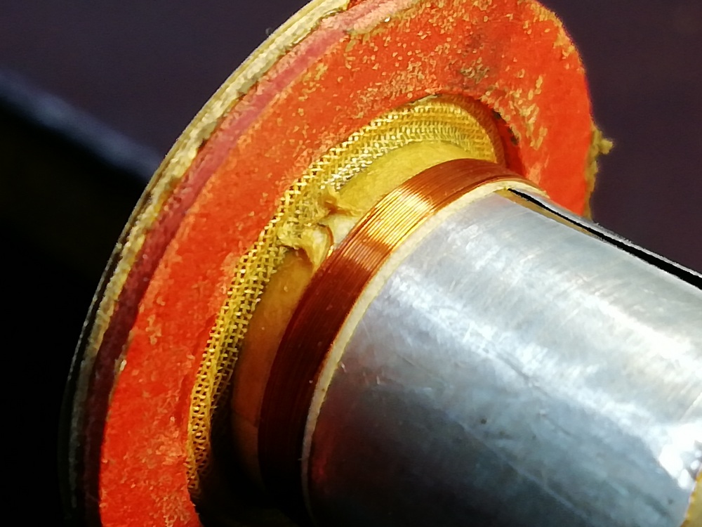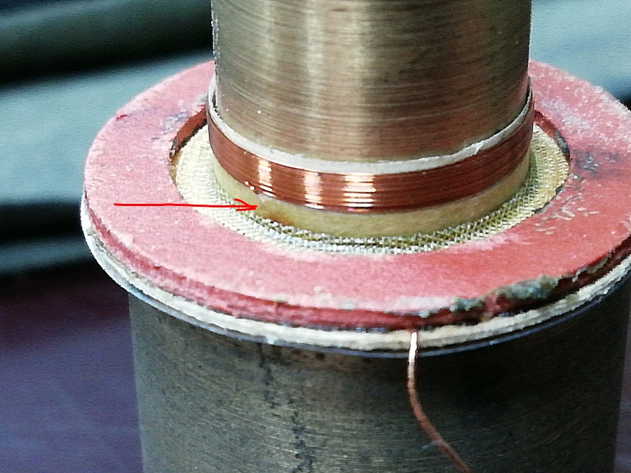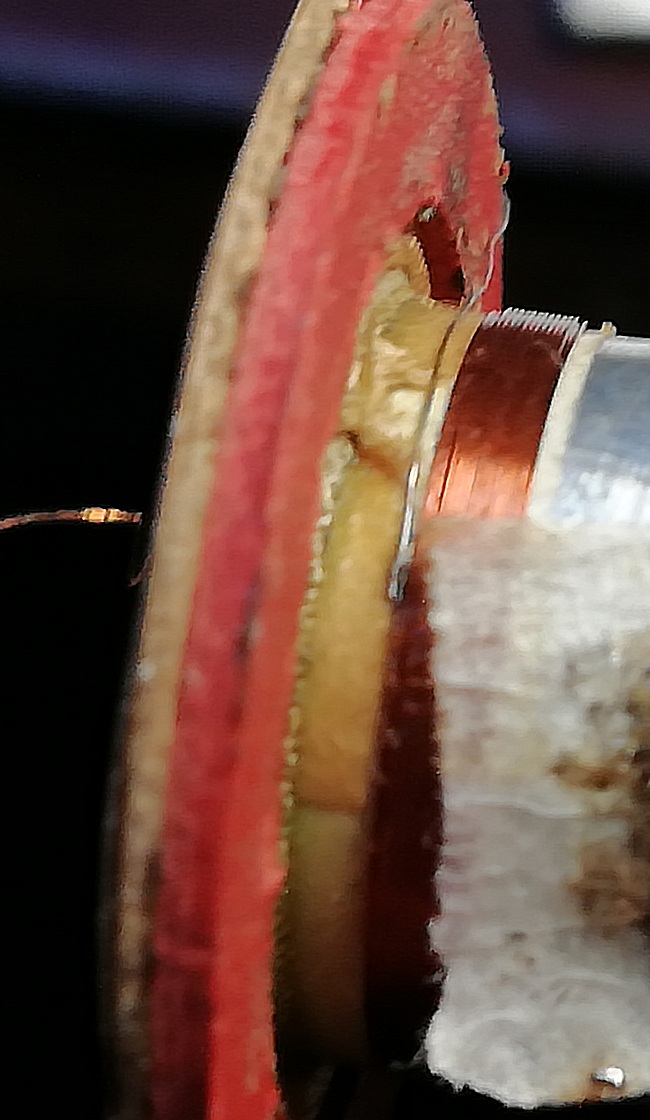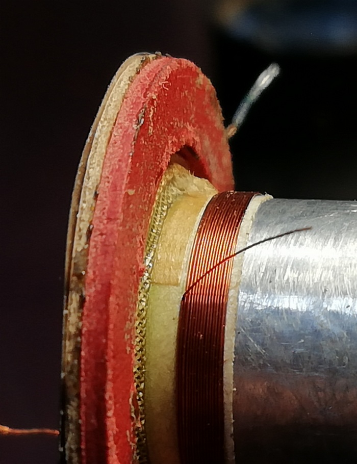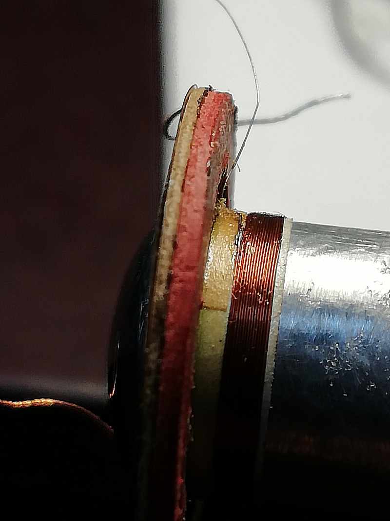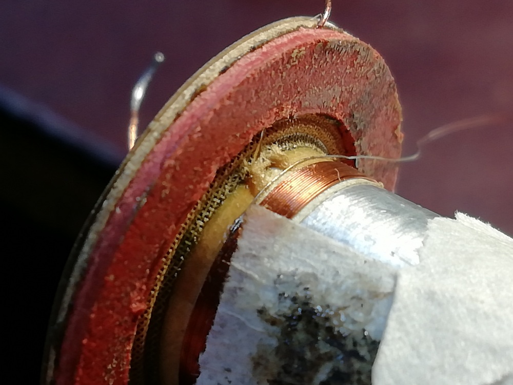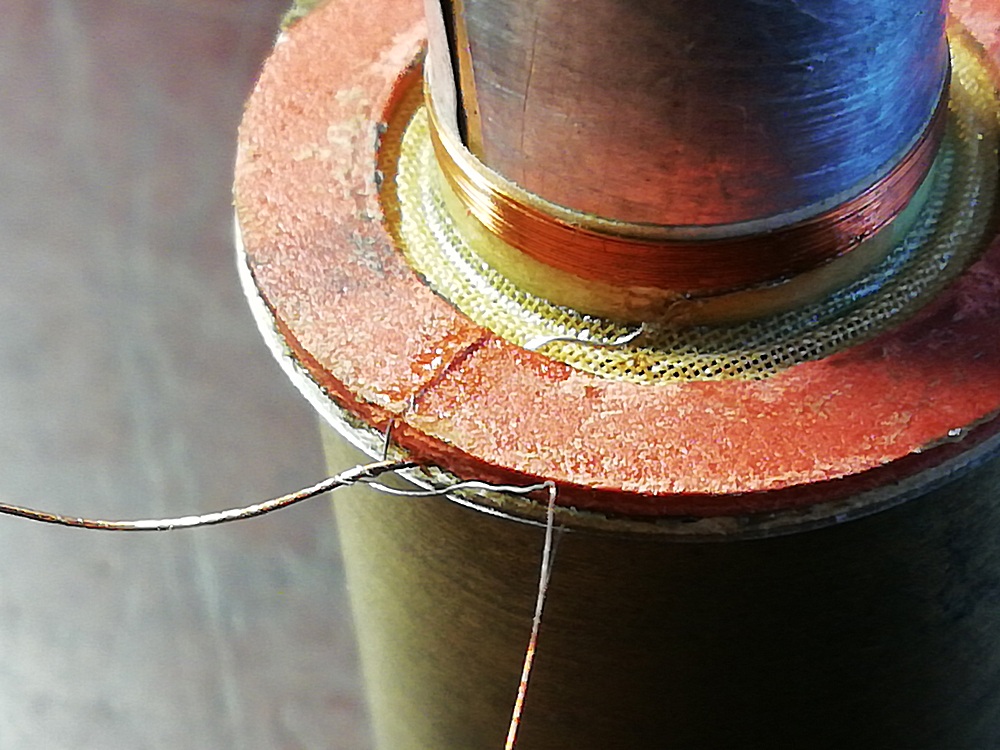 Бумажный каркас. Внешне катушка целая. Без прогаров и смещения намотки. Вероятно нарушен контакт в пайке, что довольно часто происходит с катушками на алюминиевом проводе. И то хорошо! Акустике почти полста лет и случилось это только сейчас. Постараюсь сохранить родную...