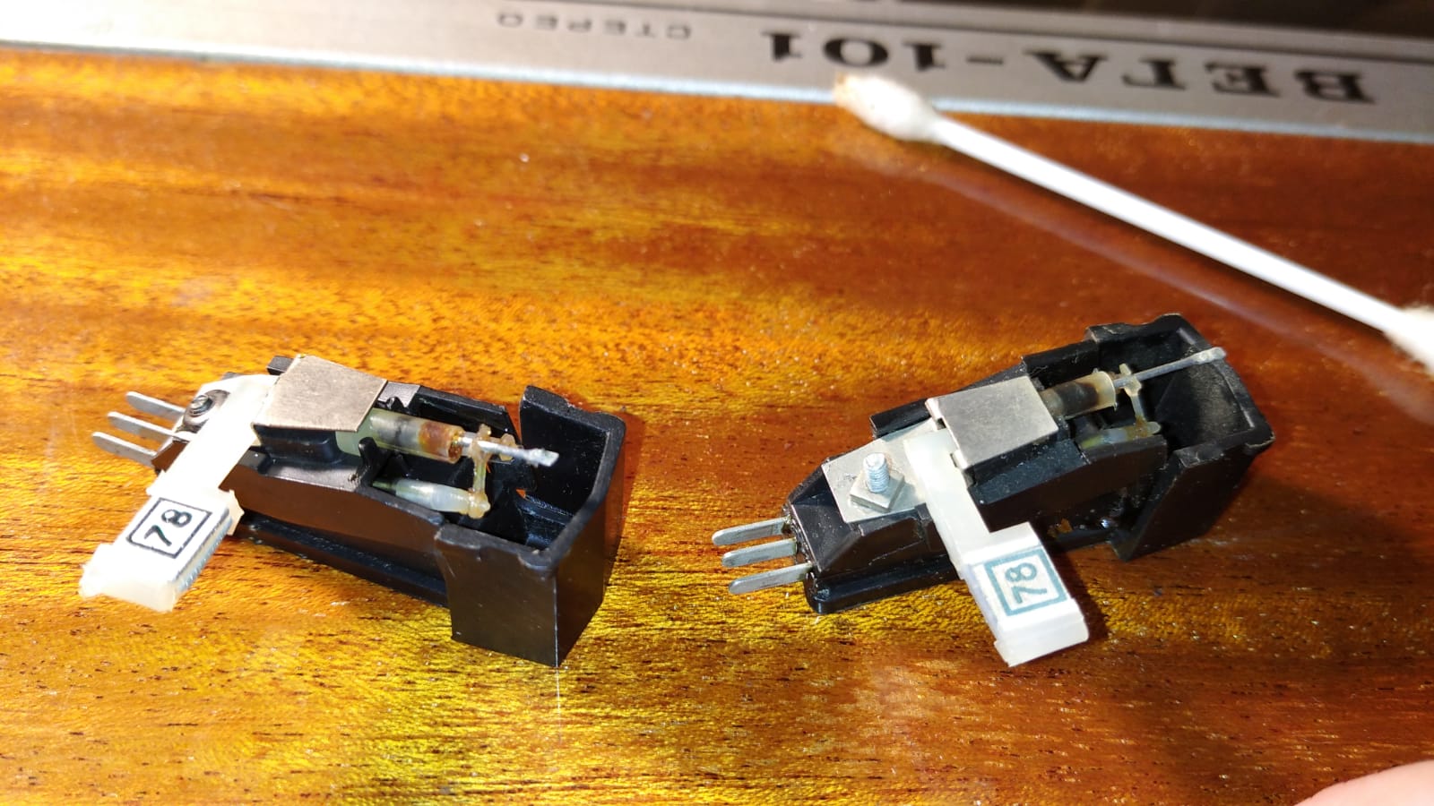 Иглы оказались одна рабочая полностью,вторая была погнутая и с вытекшим демпфером,её почистил,выровнял,играет один канал второй почти не слышно.