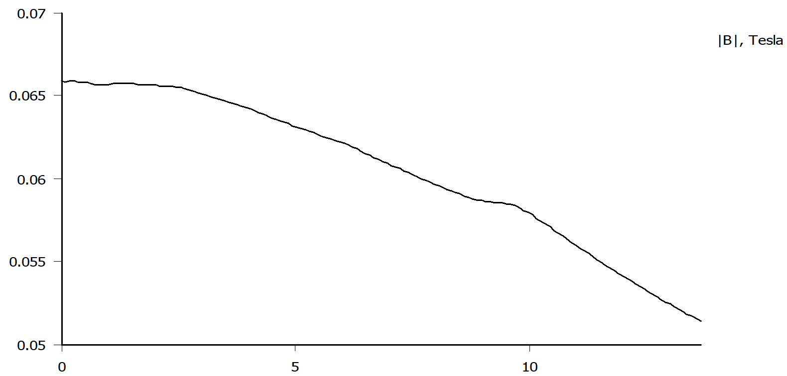При эксперименте были следующие показатели: 10мм=69.1 мТл, 20мм=28,4 мТл, 30мм=12,5 мТл