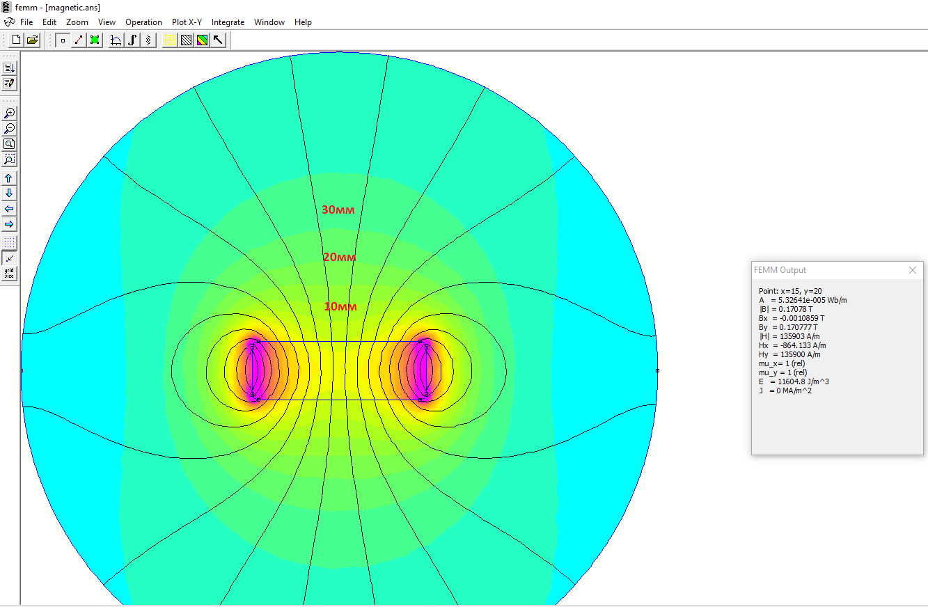 Прямоугольник в FEMM это модель в разрезе "аксиальная симметрия", мы берем половину магнита 30мм, половина это 15мм, и моделируем