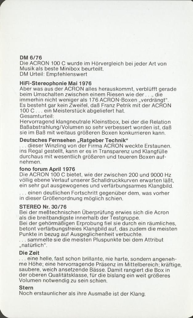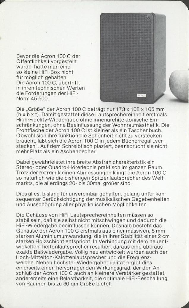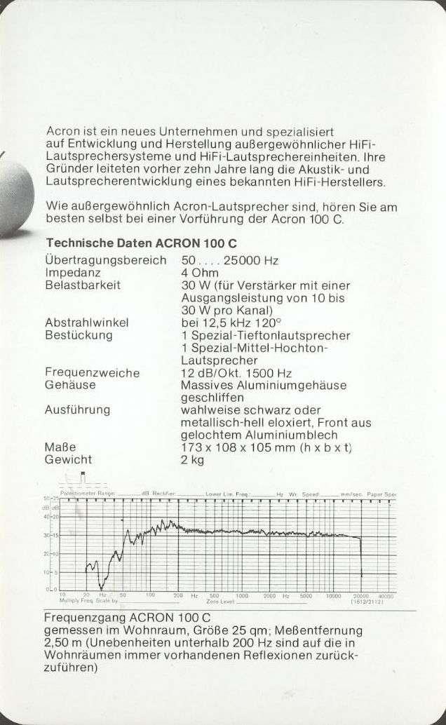 Всё началось в 1975 году, когда бывший сотрудник акустического подразделения компании Braun, известной ныне своей бытовой техникой, – инженер Франц Петрик, устав бороться с общей тенденцией к удешевлению и упрощению производства акустических систем, организовал собственный бизнес под брендом Acron. Расцвет компании пришелся на начало 80-х годов. Достаточно сказать, что в этот период колонки Acron традиционно побеждали в сравнительных тестах акустических систем, проводимых авторитетными аудио-изданиями, оставляя не удел продукцию конкурирующих производителей.