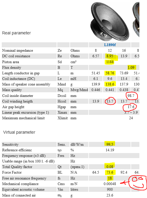 Те, кто умеет, в курсе что считать можно в любую сторону. Например у динамика с давлением 102 при некоторой площади диффузора некоторая масса и некоторые BL. Не составляет труда при примерно той же площади и незначительно отличающейся массе посчитать BL при давлении на 15 дБ больше.