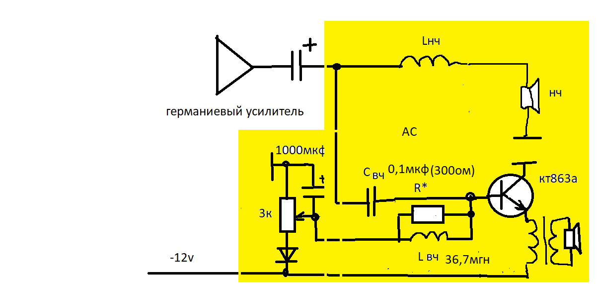 предлагаю вот такой кроссовер для германиевых усилителей на тупых сплавных транзисторах,но и для кремния тоже будет хорошо,тк чуйка вч головки большая,а вч компоненты имеют не большой уровень,то повторитель в классе А требуется тоже меньшей мощности,трансформатор тоже простой на вч АВшник будет работать на высокоомную нагрузку и не будет искажать,особенно снизится ступенька,у германца не будет нагрева и сквозных токов Lвч и Свч считаем как для нагрузки 300...400ом,точно ее подгоняем резистором,Кт транса подгоняем в зависимости от чуйки вч головки