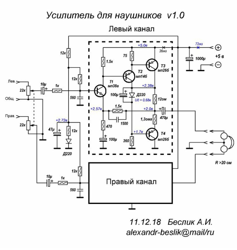 Вот та схемка от Беслика для наушников, что я вчера выкладывал, она оказалась А класса, с динамической нагрузкой.прошу в студию схему А класса на германии кроме худа и лучше по звуку