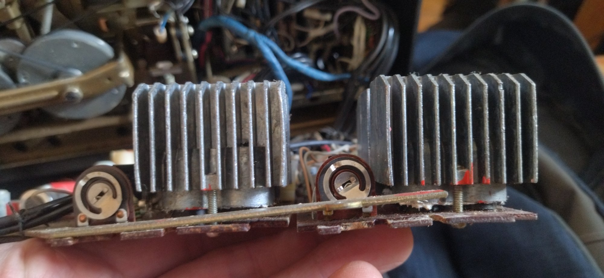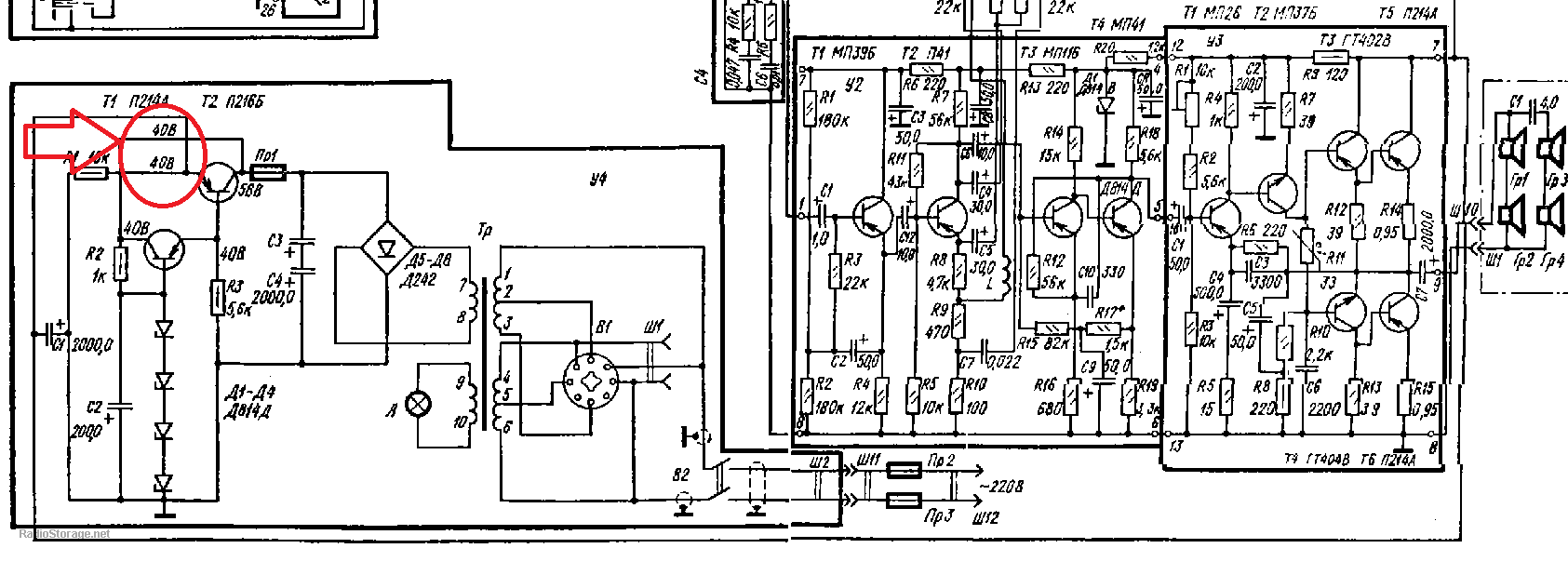 Начало провода общей коллектор кт815 и блока гт402 -404 под радиатором точка 16