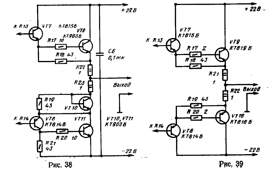 Транзисторы VT9,VT13, к ним по два резистора делителей в базах, R24R26 и R22R25.