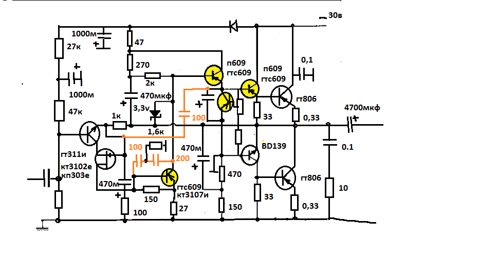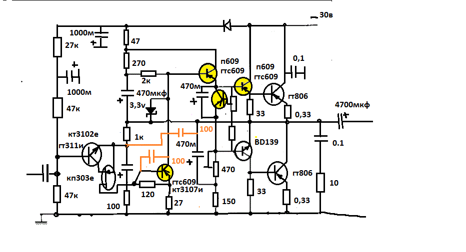 вот такой простой гибрид без оос на п210 с ОК ставим в нч канал,выходники без прокладок на радиаторе,гт701,п210,на выходе можно поставить фнч 5кгц для подавления высших гармоник,а кроссовер на входе с частотой 300...1000гц