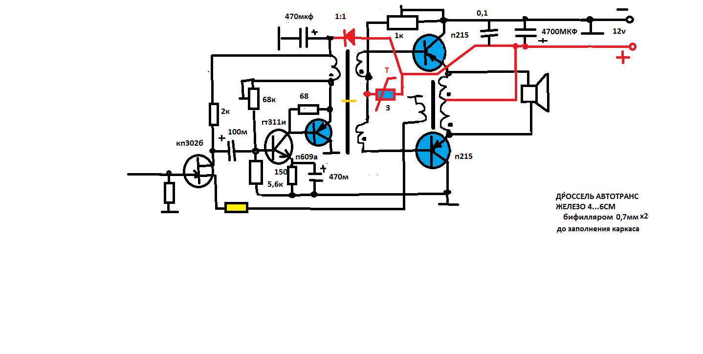 мощность 10вт на 8ом если 4ом то нужно сделать отводы на дросселе или ставить более мощные транзисторы п210