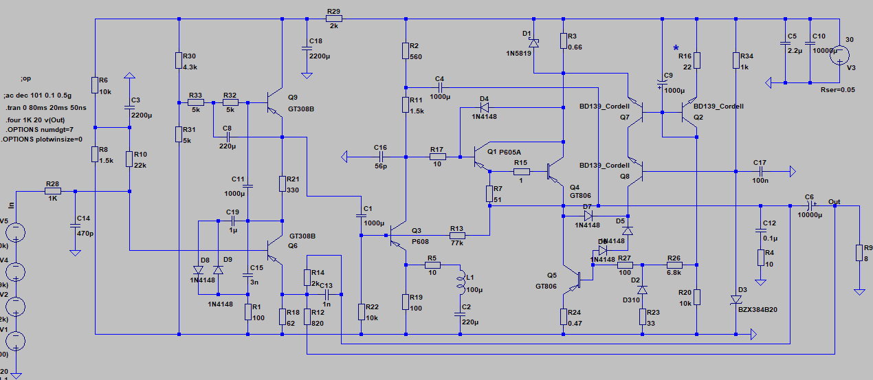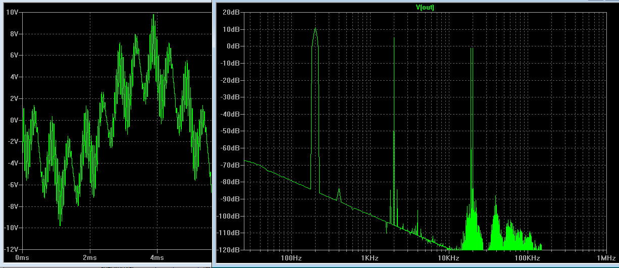 Если стабилизировать ток покоя внешними цепями, то можно и класс А, а лучше Экономичный А, с током покоя 200-250 мА. Как это работает написано здесь. На основе этой идеи насимулил такой германиевый однотакт, где в отличие от прототипа, в активном режиме оба выходных транзистора. Глубина общей ООС во всём звуковом диапазоне 66db (плюс 20-26db местной в ВК). В цепи сигнала только германиевые транзисторы, кремниевые - в цепи управления ИТ. Ток покоя выходников практически не зависит от температуры (увеличивается на 1 - 2% при разогреве до 90 гр.). Ток покоя зависит от температуры токового зеркала в цепи управления, поэтому эти транзисторы должны иметь тепловую связь и устанавливаться на отдельный небольшой радиатор. С клипом и psrr всё отлично. Добавил картинку интермодов мультитонового сигнала.Самая злая проблема это стабильный ток покоя в режиме А у германия.