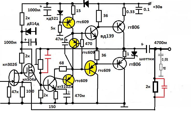 Согласен, что Т4 луше заменить на П609, тогда наверное и Т1,Т3 на КТ3102 с изменением коррекции. Просто ВК на ГТ703\705 мне кажется оптимальный вариант для германия. Может кто то подправит схему, пусть получится не самый крутой усилитель, но зато вполне слушабельный.
