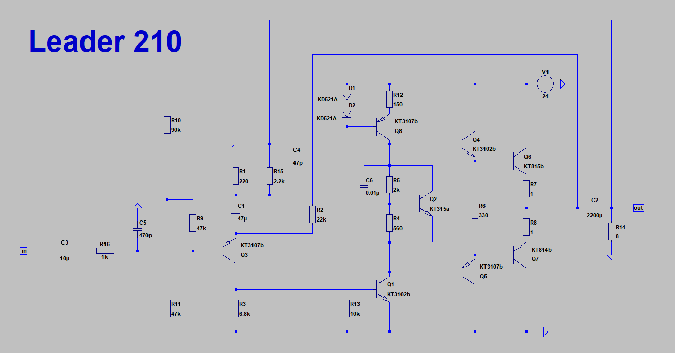 Осталось выяснить. Почему люди пытались лепить УН на транзисторах одной структуры? Ведь в леадере этом стоят продвинутые транзисторы 815, 502/503, 3107. Что, одного КТ3102 не нашлось? Или КТ315? Или КТ342? Да блин, всю эту помойку можно было упростить в два раза и снизить искажения раз в сто. Не напрягаясь. Но нет.